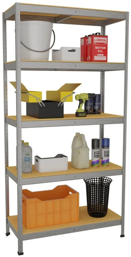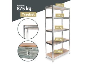 Arebos - EAN: 4260551585517 - ALLGEMEINE BESCHREIBUNG Das AREBOS Schwerlastregal bietet eine zuverlässige Lösung zur Aufbewahrung schwerer Gegenstände. Mit einer Tragkraft von bis zu 875 kg und einer robusten Stahlkonstruktion ist es ideal für Werkstatt, Keller oder Lager. Die Böden sind höhenverstellbar und das Regal lässt sich schnell und ohne Werkzeug montieren. TECHNISCHE DATEN Material Gestell: Verzinkter Stahl Material Regalböden: MDF Holzfaserplatte Anzahl Böden: 5 Maße: 180 x 90 x 40 cm Tragkraft pro Boden: 175 kg Materialstärke Gestell: 0,63 mm Farbe: Verzinkt/Silber Gewicht: 15,5 kg KOMPATIBILITäT UND ZUBEHöR Das Regal kann als Werkbank genutzt werden und ist kombinierbar mit anderen Regalen. INSTALLATION Die Montage erfolgt schnell und einfach durch ein intelligentes Stecksystem, ganz ohne Werkzeug. ANWENDUNG Das Regal eignet sich perfekt für die Aufbewahrung in Garage, Büro oder Speisekammer und schafft Ordnung. - bei manomano.de - aus Yadore Produktdaten Für nur 29.90 Euro erhalten Sie hier ein Schwerlastregal mit 875 kg Traglast und 5 Ablagen, ideal für den preisbewussten Käufer. ![]() deluxe4home® Schwerlastregal 90x40x180cm I belastbar bis 875kg I 5 Ablagen + Haken Schwarz