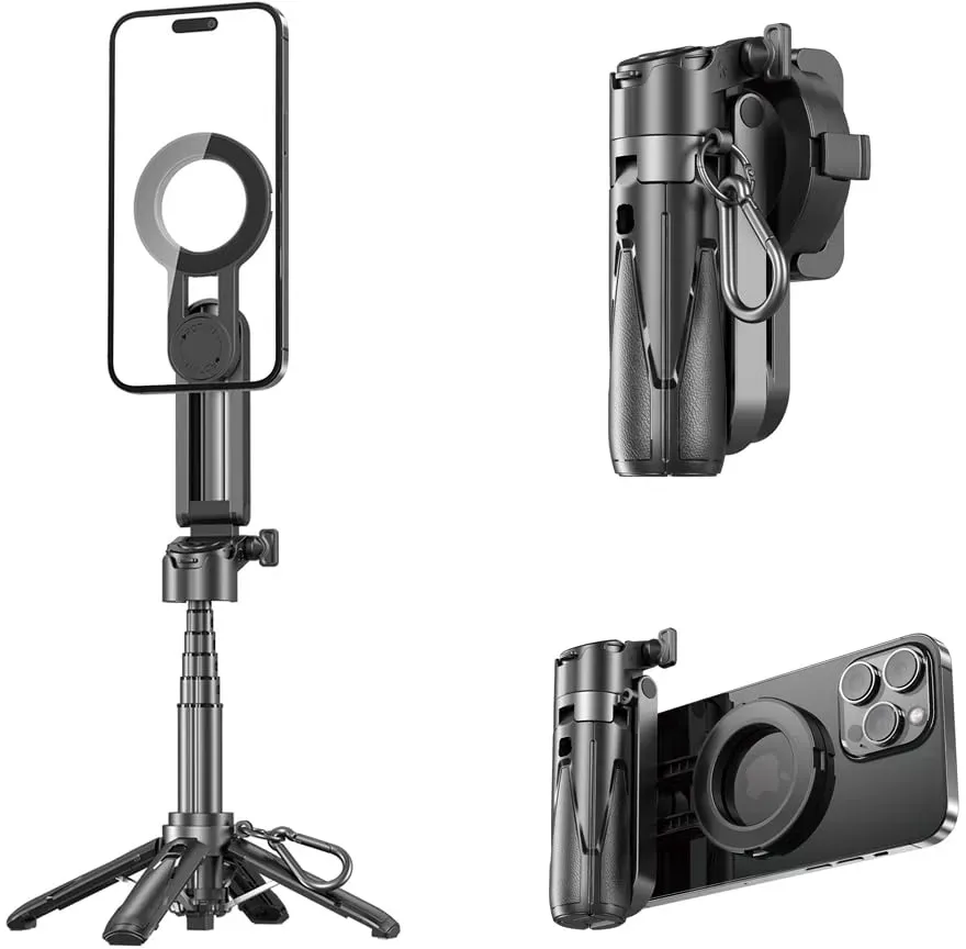 Verfügbarkeit: Gewöhnlich versandfertig in 2 bis 3 Tagen - Kategorie: Handy-Gadgets - CHENRI - SnapPro 3-in-1 Creator Stick - Stativ: Mit dem Handy-Ministativ können Sie aus jedem Winkel die gewünschte Aufnahme machen, egal ob Sie ein Video aufnehmen oder ein Selfie machen. 360° schwenkbar: Das Mini-Tischstativ verfügt über eine 360°-Schwenkfunktion, um zwischen Hoch- und Querformat zu wechseln. Ausziehbar: Das ausziehbare Mini-Kamerastativ lässt sich in Sekundenschnelle aus- und zusammenklappen - perfekt für Videofilmer, Reisende und andere. Bluetooth-Fernbedienung: Mit der abnehmbaren Bluetooth-Fernbedienung, die in einer Entfernung von bis zu 10 Metern funktioniert, können Sie ganz einfach Gruppenfotos aufnehmen oder persönliche Inhalte aufzeichnen. Unverzichtbar für Fotos: Das vielseitige Stativ besteht aus Kunststoff und einer Aluminiumlegierung und ist ideal für die meisten Smartphones und Kompaktkameras. - 15,65 Euro bei Amazon Marketplace CE - gefunden von billiger.de Der MOJOGEAR TS2 für 28,23 Euro ist ein magnetischer 6-in-1 Mini Selfie Stativgriff, der besonders für MagSafe iPhones geeignet ist und eine abnehmbare Fernbedienung bietet. ![]() ![]() MOJOGEAR TS2 6-in-1 Mini Selfie Stativgriff - Magnetischer Selfie Stick und Tischstativ für MagSafe iPhone - Ausziehbar bis 47,5 cm mit Abnehmbarer Bluetooth Fernbedienung und Smartphone Klemme