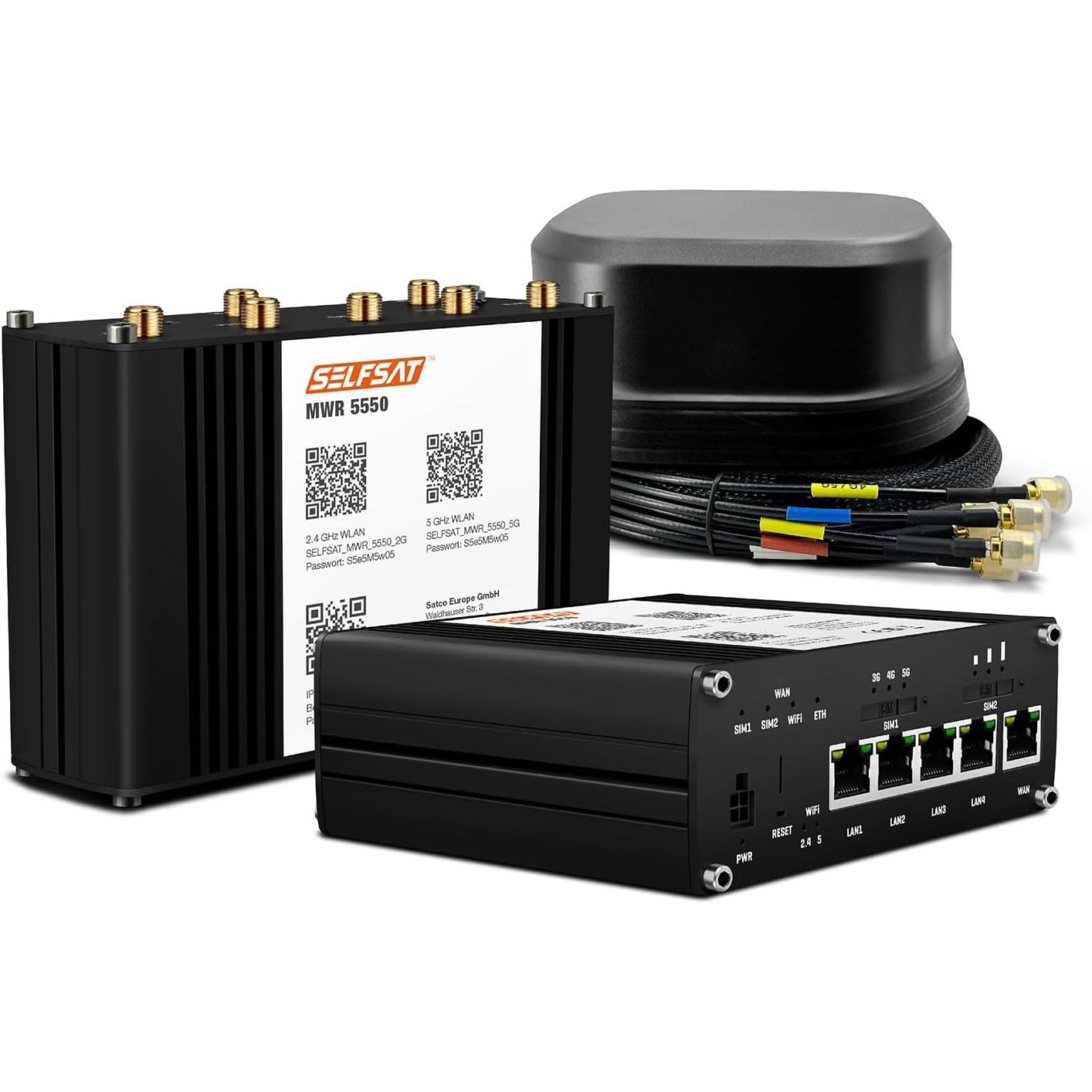 Zustand: Neu - Router - SELFSAT Selfsat - MWR 5550 - EAN: 3700433898881 - œ Im Wohnmobil oder Wohnwagen wünschen sich Besitzer eine gute Internetverbindung wie zu Hause œ Der SELFSAT MWR 5550 ist ein Router, der über ein 12 Volt Bordnetz oder einen 230 Volt Anschluss betreiben werden kann œ Er kann ein eingehendes WLAN-Signal, oder dank einer eingelegten SIM-Karte, ein Mobilfunknetz-Signal empfangen und ein privates, passwortgeschütztes WLAN-Signal aussenden œ Darüber hinaus können Sie mehrere Geräte gleichzeitig mit dem Router verbinden œ Dieser hat keine SIM-Sperre und kann mit den Auflade-SIM-Karten (Prepaid) oder Vertrags-SIM-Karten (Postpaid) der verschiedenen Anbieter verwendet werden - Verkäufer: âââââ HM-Sat-Shop im amazon.de Marketplace Dieses Angebot ist mit 599,99 Euro eines der günstigsten für den reinen Router ohne spezielle Antenne und bietet ein hervorragendes Preis-Leistungs-Verhältnis für den Einstieg. ![]() ![]() SELFSAT MWR 5550-5G / 4G LTE / 3G & WLAN Router mit bis 3,3 Gbit/s