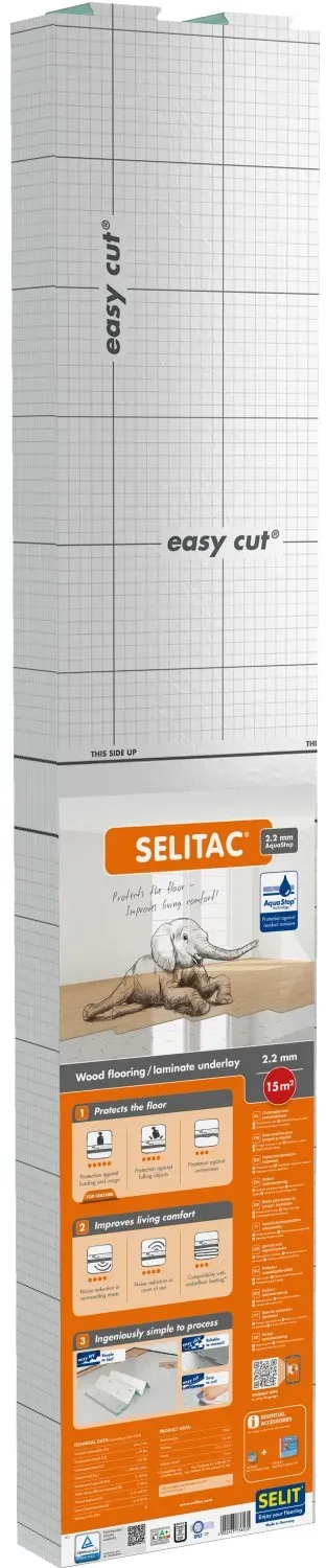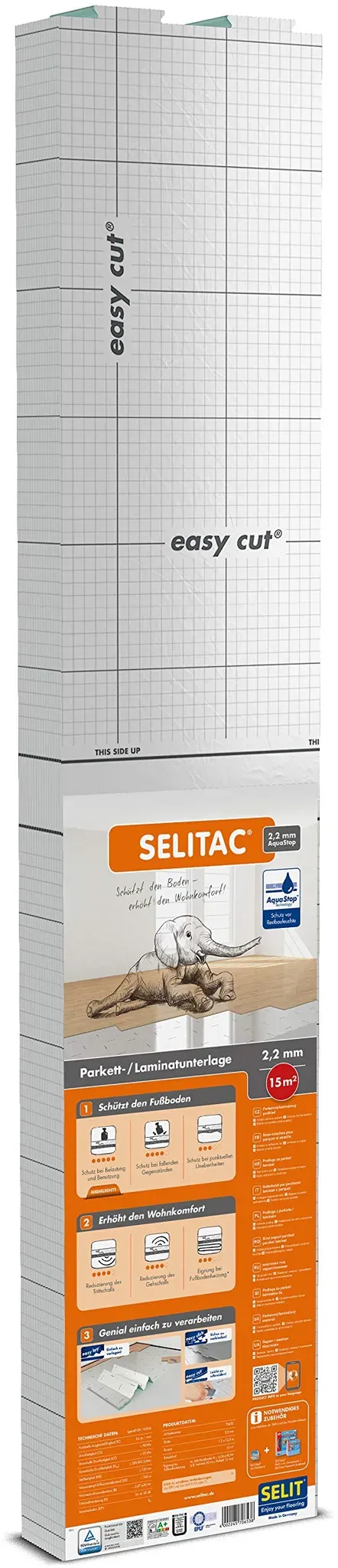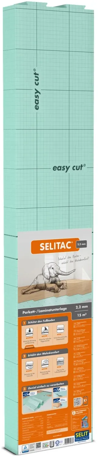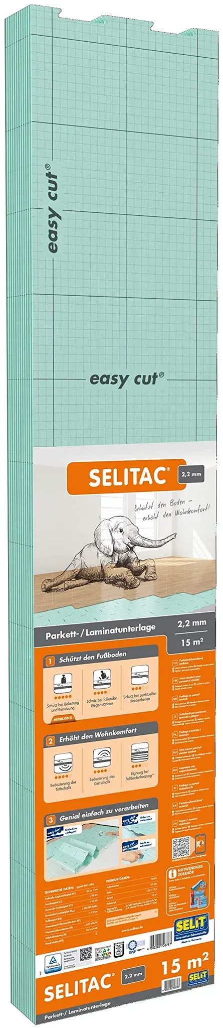 1 Händlerangebote bei billiger.de - Kategorie: Bodenbelag-Zubehör - Selit - VERLEGEUNTERLAGE - Geeignet für die schwimmende Verlegung von Parkett und Laminat auf Holzuntergründen - In Verbindung mit einer Feuchteschutzfolie ist sie auch für mineralische Untergründe geeignet GERINGE AUFBAUHöHE - Die Laminatboden Unterlage ist mit der Stärke von 2,2 mm ideal, wenn nur eine geringe Aufbauhöhe möglich ist GEEIGNET FüR KLICKLAMINAT - Die enorme Druckstabiltät schützt den Laminat- und Parkettboden vor Beschädigungen bei hoher Belastung und Benutzung OPTIMALE AKUSTIK - Die zuverlässige Minderung des Trittschalls in unteren Räumen und des Gehschalls im selben Raum sorgt für eine angenehme Akustik - Dämmunterlage optimal geeignet für Etagenwohnungen AUSGEZEICHNETE QUALITäT - Mit dem Blauen Engel als besonders umweltverträgliches Produkt ausgezeichnet und vom TüV hinsichtlich Qualität, Funktionalität und Gebrauchseigenschaften zertifiziert - GTIN:4002245706767 ![]() ![]() Selitac® Trittschalldämmung für Parkett und Laminat 2,2 mm 15 m2