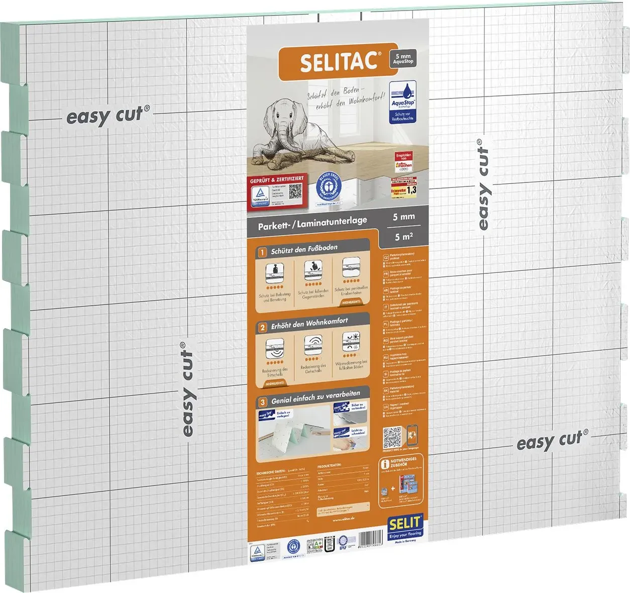 Selitac aqua stop 5 mm META PreisvergleichMit dem Meta-Preisvergleich suchen Sie gleichzeitig bei den großen Preisvergleich Portalen!Jetzt live Suche nach selitac aqua stop 5 mm starten! Selitac aqua stop 5 mm KaufberatungDie SELITAC 5 mm AquaStop ist eine Trittschalldämmung mit integrierter Feuchtigkeitssperre, die speziell für die schwimmende Verlegung von Laminat und Parkett auf mineralischen Untergründen wie Estrich oder Beton entwickelt wurde. Sie bietet eine Kombination aus Wärmedämmung, Trittschallminderung (bis zu 22 dB) und Schutz vor aufsteigender Feuchtigkeit durch die AquaStop-Technologie[1][3][5][7]. Wichtige Produktmerkmale und Hinweise:
