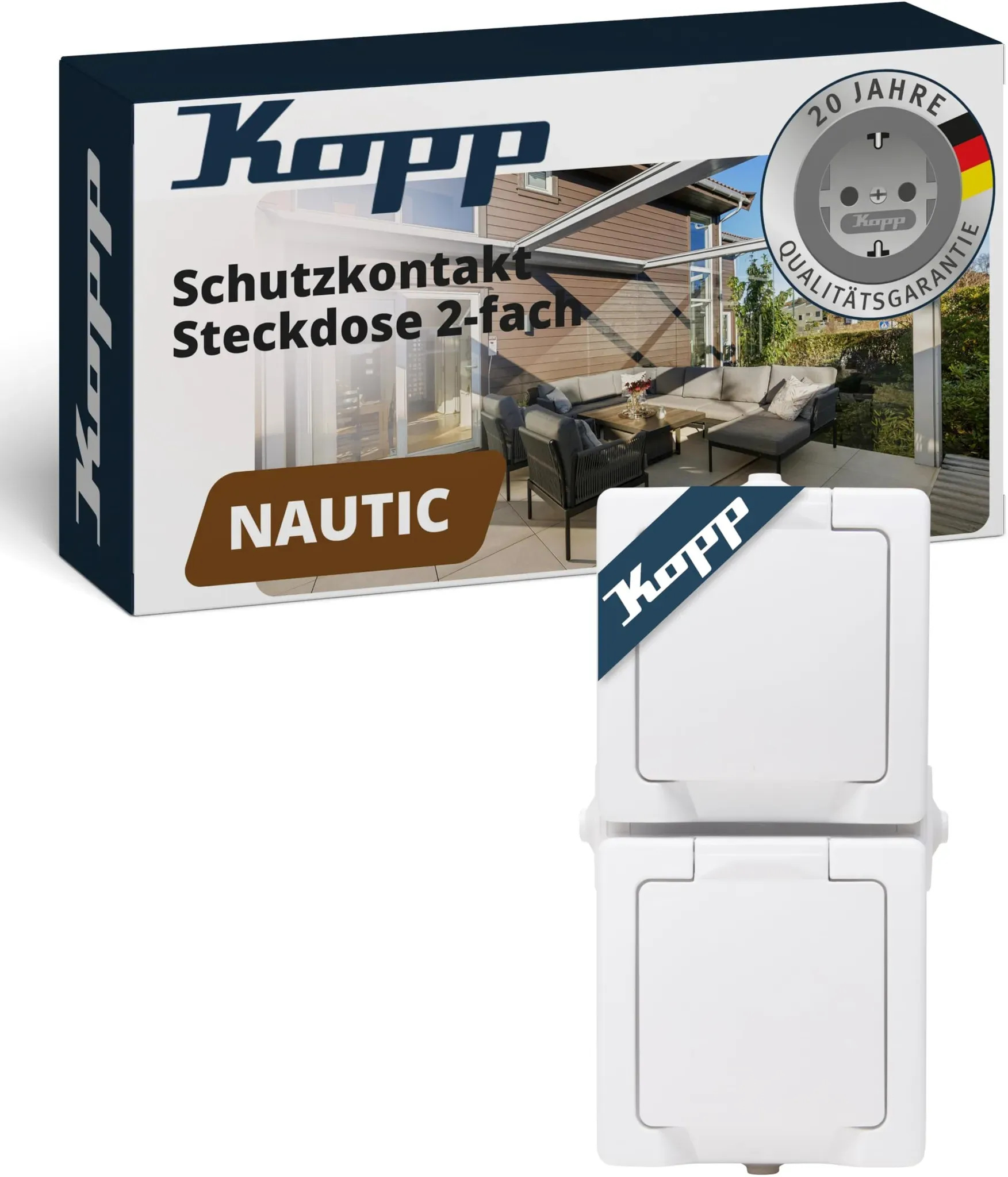 Auf Lager Versand durch AmazonKopp NAUTIC 2-fach Schutzkontakt-Steckdose mit Klappdeckel in Arktis-Weiß - Sichere Aufputz-Steckdose mit erhöhtem Berührungsschutz - Senkrechter IP44 Feuchtraumsteckdosen-Aufputz 16A / 250V~