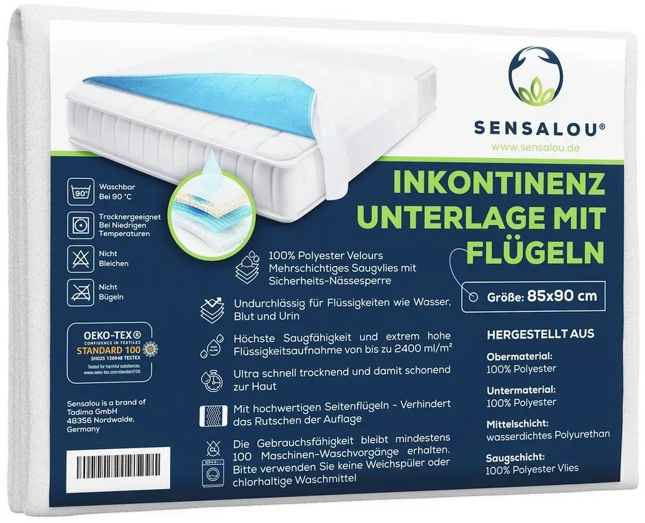 Zustand: Neu - Matratzenschutz Matratzenschutz für Babybetten - Sensalou - BU11PK7010 - EAN: 4260460298614 - Die wasserundurchlässige Sensalou Auflage schützt Ihre Matratze zuverlässig vor Urin, Wasser & Blut Die wasserundurchlässige Sensalou Auflage schützt Ihre Matratze zuverlässig vor Urin, Wasser & Blut Bis 95 Grad waschbare Inkontinenz Betteinlage u.a. für Erwachsene und Senioren - Trockner geeignet Fürs Kinderbett und Babybett - Als Kinder Bettnässer Unterlage, oder Baby Gitterbett Matratzenschutz Öko Tex zertifizierte Bettauflage ohne Gummi für einen gesunden Schlaf - Wasserbett & Sofa geeignet - Verkäufer: Tadima GmbH im amazon.de Marketplace ![]() ![]() Sensalou Inkontinenz - Bettunterlage 90x160cm eBay Neu in Originalverpackung!