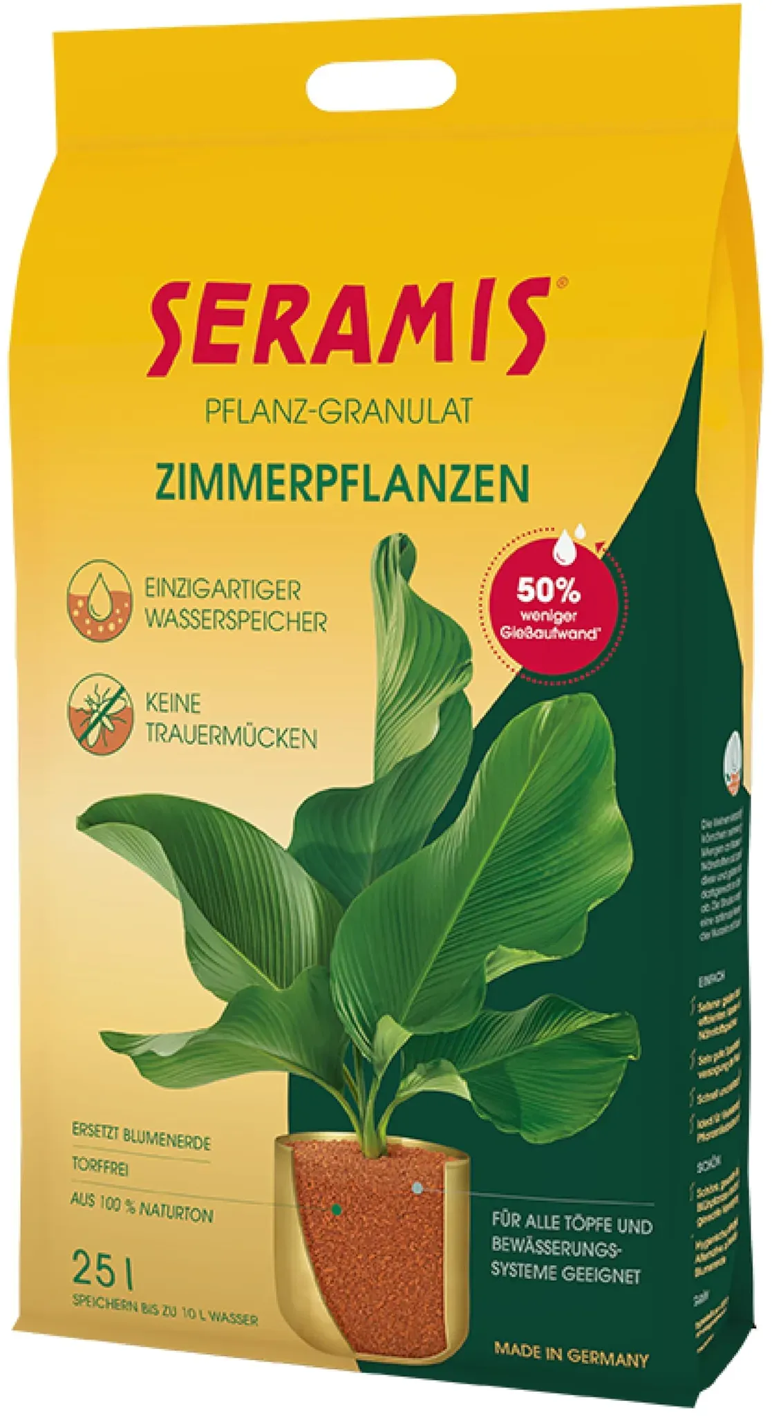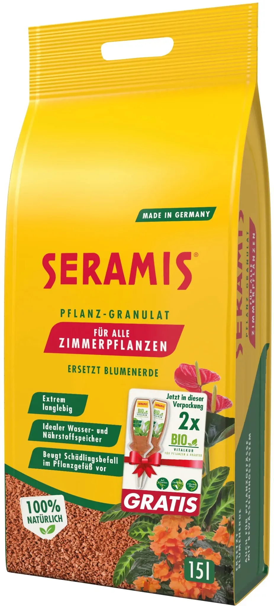 2.60 /l - Kategorie: Blumenerde - Seramis - GTIN:4260376735425 - Das Seramis Pflanz-Granulat eignet sich ideal für die Anzucht und das Umtopfen von Pflanzen und Kräutern. Das Pflanzsubstrat aus dem neuen Seramis Sortiment ist auch für den biologischen Anbau geeignet und bietet die ideale Pflege Ihrer Kräuter und Pflanzen. Organisches Substrat Das Seramis Pflanzgranulat ist ein Produkt ohne mineralische Vordüngung. Das Pflanzsubstrat wird aus einem Ton gewonnen, der im Westerwald abgebaut und unweit der Abbaustelle verarbeitet wird. Die Verpackung wird anteilig aus recyceltem Plastik aus Produktionsabfällen hergestellt und ist zu 100 % recyclingfähig. Wasserspeicher-Granulat für Pflanzen Das Granulat für Pflanzen nimmt Wasser und Nährstoffe auf und gibt diese bei Bedarf an die Pflanzen und Kräuter ab. Weiterhin werden die Wurzeln immer optimal mit Sauerstoff versorgt. Das Seramis Substrat altert und verdichtet nicht und ermöglicht ein ganzjähriges Umtopfen. Zudem ist das Pflanz-Granulat sauber, sicher, schnell in der Anwendung und verhindert den Schädlingsbefall beispielsweise durch Trauermücken. We are gardening: Granulat für Pflanzen, Zimmerpflanzen & Küchenkräuter Das Seramis Tongranulat ist gleichermaßen als Substrat für Pflanzen und für den biologischen Anbau von Küchenkräutern geeignet. Die Kräuter können Sie dank der Zusammensetzung unbedenklich verwenden. Bei Zimmerpflanzen verlängert das Substrat die Gießintervalle und sorgt für eine ideale Versorgung der Pflanzen ... Für Palmenliebhaber ist dieses 7-Liter-Gebinde eine gute Wahl, um die speziellen Anforderungen dieser Pflanzen zu erfüllen. Globus- baumarkt.d e Seramis Spezial-Substrat für Palmen 7 l