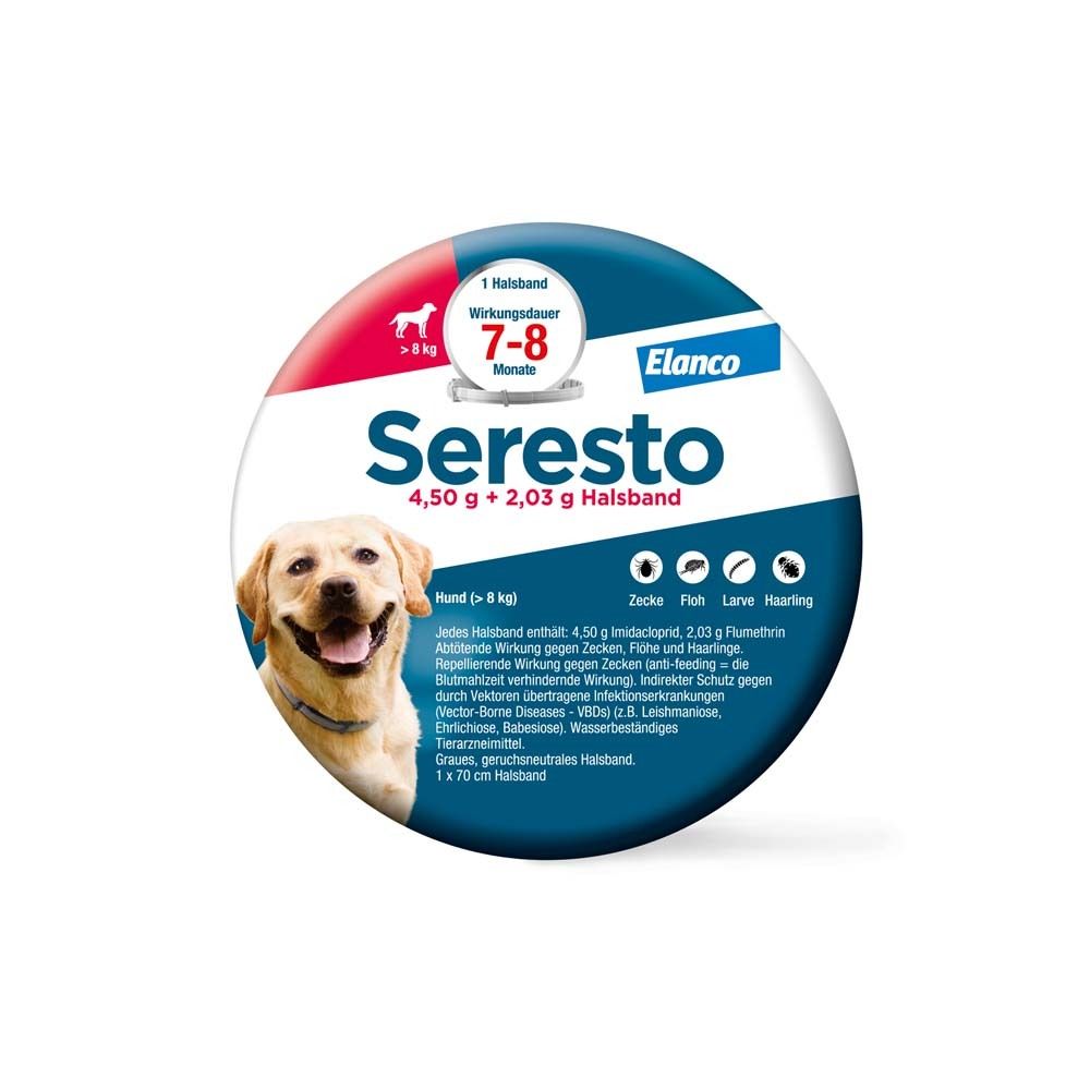 35,00 €/St - Kategorie: Hundehalsbänder - SERESTO - GTIN:4150800279352 - PZN:80027935 - Seresto Halsband für kleine Hunde 8 kg 2X1 St - rezeptfrei - von Elanco Deutschland GmbH - - 2 St - 69,99 Euro bei DocMorris Apotheke - gefunden von billiger.de Ein preislich interessantes Doppelpack für große Hunde von DocMorris Apotheke, das langfristigen Schutz sichert. ![]() ![]() Seresto Halsband für große Hunde > 8 kg 2X1 St