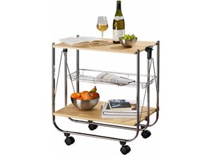 Zustand: Neu - Servierwagen - Relaxdays - 10022164 - EAN: 4052025221645 - Allzweckwagen: Speisen mit dem mobilen Küchenwagen ins Ess- oder Wohnzimmer transportieren - Teewagen für den Balkon oder die Terrasse - Vielseitig nutzbarer Rollwagen mit 2 Arbeitsplatten Klappbar: Die untere Ablage liegt lose auf und lässt sich unkompliziert einklappen - Die obere Ablage lässt sich mithilfe kleiner Riegel stabilisieren - Bei Bedarf Wagen platzsparend verstauen Fahrbar: Servierwagen mit 4 komplett beweglichen Rollen - 2 Rollen des Servicewagens haben Bremsen - Die schwarzen Kunststoffrollen bewegen sich geräuscharm und schonen Fliesen sowie Bodenbeläge Angenehme Optik: Der Beistellwagen besteht aus natürlich gemasertem - Die warmen Farben fügen sich in jede Einrichtung sehenswert ein - Nachhaltiges und schnell nachwachsendes Material Starke Details: Dank des Halters können Sie 3 Flaschen auf einmal transportieren und servieren - Jede der ca. 34 x 54 cm (BxT) großen Arbeitsflächen mit leicht erhöhten Rändern trägt 8 kg Gewicht - Verkäufer: Amazon im amazon.de Marketplace Ein kompakter Servierwagen mit drei Ebenen, ideal für kleine Räume und als Mehrzweckwagen. ![]() ![]() deluxe4home® Servierwagen mit 3 Ebenen Klappbar I Servierwagen Küchenwagen mit Griff I Rollen mit Bremsen I Kleiner Nischenwagen Aufbewahrung und Mehrzweckwagen