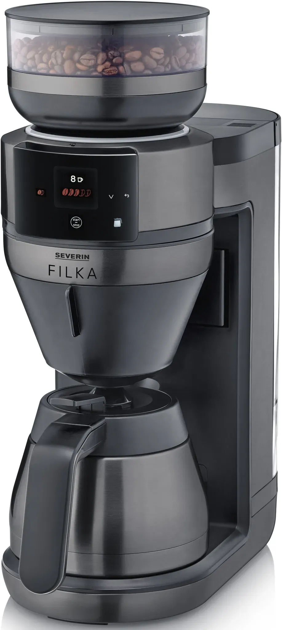 104,95 / 1 Stück - Kategorie: Kaffeemaschinen - Severin - GTIN:4008146034978 - Mit der SEVERIN Filterkaffeemaschine Duo, mit 2 Thermokannen gelingt die Zubereitung von Kaffee in großen Mengen dank zwei Thermokannen (je 8 Tassen Füllinhalt pro Kanne) schnell und unkomplizert. Die Thermokannen sind mit Durchbrühdeckeln ausgestattet und sorgen so für einen langanhaltenden und heißen Kaffeegenuss. Zudem sorgen zwei gut sichtbare Wasserstandsanzeigen und die zwei Schwenkfilter (1 x 4 mit Tropfverschluss) für eine komfortable und unkomplizierte Bedienung. Und wenn die Maschine mal verstaut werden soll, verschwindet das Anschlusskabel platzsparend im Kabelfach. - 104,95 Euro bei hygi.de - gefunden von billiger.de Dieses High-End-Modell ist mit 359 Euro ein Filterkaffee-Vollautomat mit Mahlwerk und Thermokanne für anspruchsvolle Kaffeeliebhaber. ![]() ![]() Severin Kaffeemaschine mit Mahlwerk KA 4855 FILKA (2. Generation), Filterkaffee-Vollautomat , 1,1 l, Kaffeekanne, Papierfilter-Permanentfilter, 1x4, mit Thermokanne