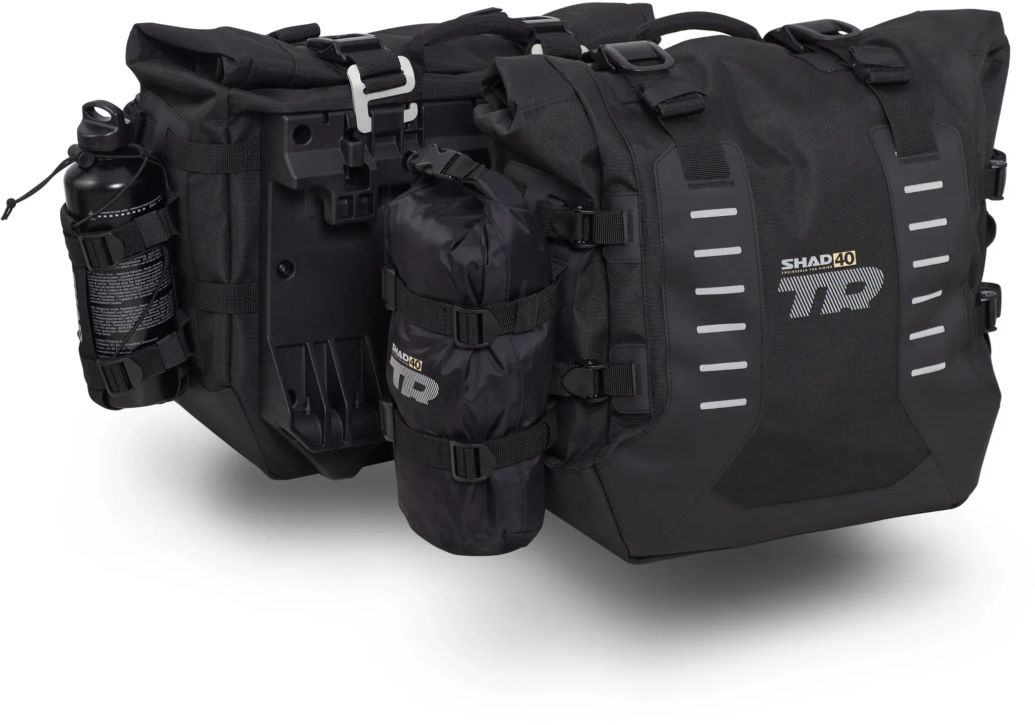 Verfügbarkeit: 1-3 Werktage - Kategorie: Motorradkoffer - Shad - GTIN:8430358680531 - TR40 Seitentaschen Volumen: ca. 64 Liter, schwarz - Für alle, die mit ihrem OFF-Road tauglichen Motorrad gern Adventure-Touren unternehmen, hat Shad das *TR40* Seitentaschen-Set mit 64 Liter Volumen entwickelt. Es gehört zur Shad Terra Kollektion und besteht aus zwei robusten Taschen aus hochabriebfestem Textilmaterial mit jeweil 32 Litern Fassungsvermögen sowie 10 kg Zuladung. In Verbindung mit Regenhauben, Innentaschen und Rollverschlüssen sind die Taschen wasserdicht. Zudem haben sie verstärkte Nähte und Böden. Dank ihres geringen Gewichts und ihrer perfekten Integration in das Shad *4P*-System (Seitenhalter), eignen sich die TR40-Satteltaschen für sportliches Fahren im Gelände und bieten darüber hinaus ein Plus an Funktionalität mit ihren 8 verstärkten Befestigungspunkten (pro Tasche), an denen zusätzliches Zubehör befestigt werden kann. Zum Shad *TR40* Seitentaschen-Set gehören außerdem ein Flaschengurt und eine wasserdichte Außentasche, die in jedes MOLLE-System eingebaut werden kann. Befestigung: 4-Punkt-Befestigungsplatte aus hoch widerstandsfähigem und glasfaserverstärktem Polyamid integriert vorbereitet für modelspezifisches Shad *4P*-Seitenhaltersystem (10067940, bitte separat bestellen) *Double Locking System* zur Verriegelung der Taschen über das 4-Punkt-Befestigungssystem am Motorrad, gleichzeitig wird der Zugriff ins Tascheninnere verhindert ... Ein Angebot für die Shad TR40 weichen Abenteuerkoffer. ![]() ![]() SHAD TR40 - weiche Abenteuerkoffer