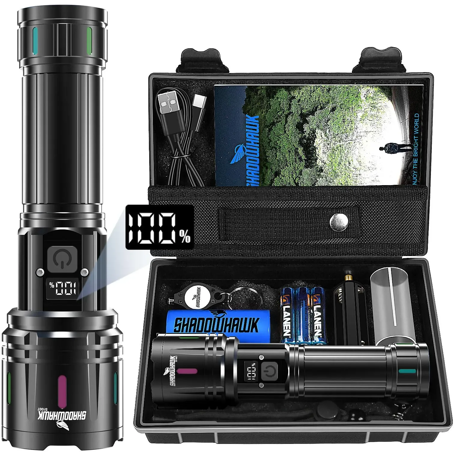Auf Lager Versand durch AmazonShadowhawk LED Taschenlampe Aufladbar, Extrem Hell 1000000 Lumen Taschenlampen Batteriebetrieben USB, XHP70.2 Taktische Taschenlampe, IP67 Wasserdicht 5 Lichtmodi Zoombar für Camping Wandern Notfälle