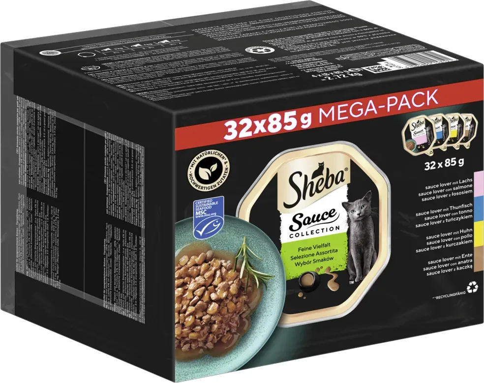 Verfügbarkeit: ca. 3 Werktage - 5,07 €/kg - Kategorie: Katzenfutter - Sheba - GTIN:3065890158191 - SHEBA® Schale Multipack Sauce Collection Feine Vielfalt MSC 32x85gHerzhafte Häppchen mit einer großzügigen Portion schmackhafter Sauce für alle Sauce Lovers. überzeugende Geschmacks-Kombinationen für mehr Vielfalt, die deine Katze lieben wird. Erhältlich in praktischen, recyclingfähigen SHEBA® Katzenfutterschalen mit je 85g. Katzennassfutter in herzhafter Sauce, hergestellt mit natürlichen und hochwertigen Zutaten, die von unseren zuverlässigen Lieferanten bezogen werden. Das hochwertige SHEBA® Katzennassfutter für ausgewachsene Katzen bietet deiner Samtpfote täglich eine komplette und ausgewogene Ernährung. Lachs- und Thunfisch-Rezepturen, mit MSC-zertifiziertem Fisch aus nachhaltiger Fischerei. Eine köstliche Auswahl mit Huhn, Ente, Lachs und Thunfisch mit extra Sauce. Ohne künstliche Farb- oder Konservierungsstoffe. Erhältlich in praktischen, leicht zu öffnenden und portionierbaren SchalenBei SHEBA® stellen wir seit über 4 n hochwertiges, köstliches Katzenfutter und Leckerlis ohne unerwünschte Inhaltsstoffe her. Diese schmackhaften und hochwertigen Katzenfutter-Hochgenüsse sind in verschiedenen Ausführungen, Geschmacksrichtungen und Texturen erhältlich und werden für deine Katze jeden Tag aufs Neue zu einem wahren Fest der Sinne. Diese abwechslungsreiche Auswahl sorgt täglich für unvergessliche Momente der Begegnung zwischen dir und deiner ... Dieses Angebot ist empfehlenswert, da es ein Megapack mit Lachs zu einem sehr guten Preis pro Einheit bietet. ![]() zooplus DE 28x 85g Megapack Sheba Varietäten Frischebeutel Selection in Sauce mit Lachs Katzenfutter nass
