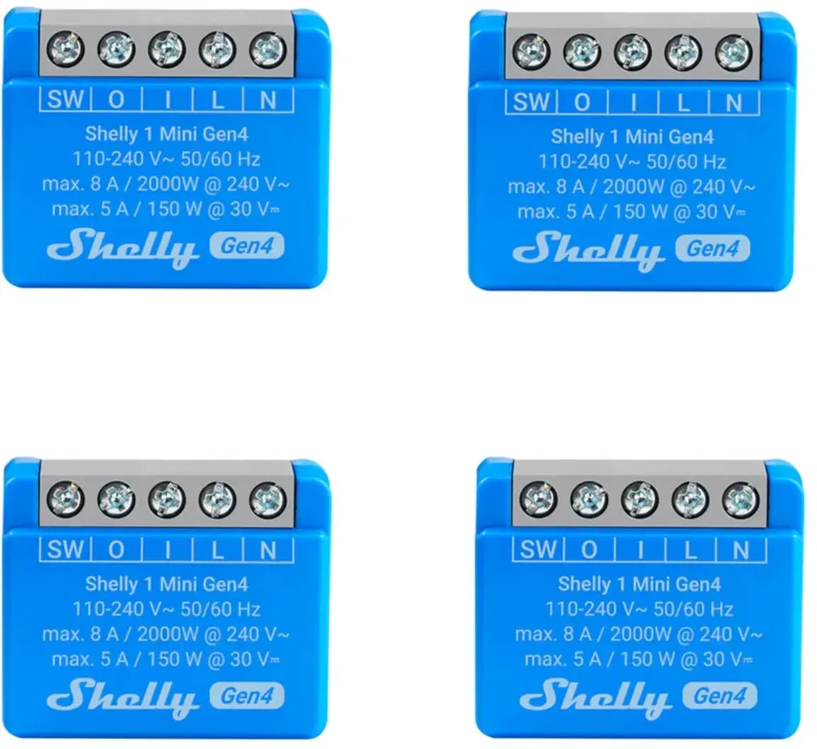 Kategorie: Sonstige Elektroinstallationsartikel - Shelly - GTIN:3800238073114 - 1-Kanal-Smart-Steuerung: Unterstützt bis zu 8A bei 240 V AC oder 5A bei 30V DC; passt platzsparend hinter Wandschalter oder in Verteilerdosen Potentialfreie Kontakte: Perfekt zur Steuerung von (Garagen-)Toren, Heizkesseln oder Niederspannungsschaltungen App- & Sprachsteuerung: Steuere Deine Geräte von überall mit der Shelly Smart Control App oder Sprachassistenten wie Alexa, Google Home, Apple HomeKit und SmartThings kein Hub erforderlich WLAN-gesteuert + Schnellinstallation: 2,4 GHz-WLAN für eine unterbrechungsfreie Smart-Home-Steuerung; Bluetooth, Zigbee und Matter für eine vereinfachte Einrichtung Neu in Gen4: Jetzt mit integrierter Matter- und Zigbee-Kompatibilität, verbesserter Rechenleistung und erweiterten Skriptfunktionen für noch smartere Automatisierung - 67,44 Euro bei Amazon Marketplace Automotive - gefunden von billiger.de Ein 4er-Pack des Shelly 1PM Gen4 mit Leistungsmessung, um den Energieverbrauch von vier Geräten zu überwachen und zu steuern. Pollin.de