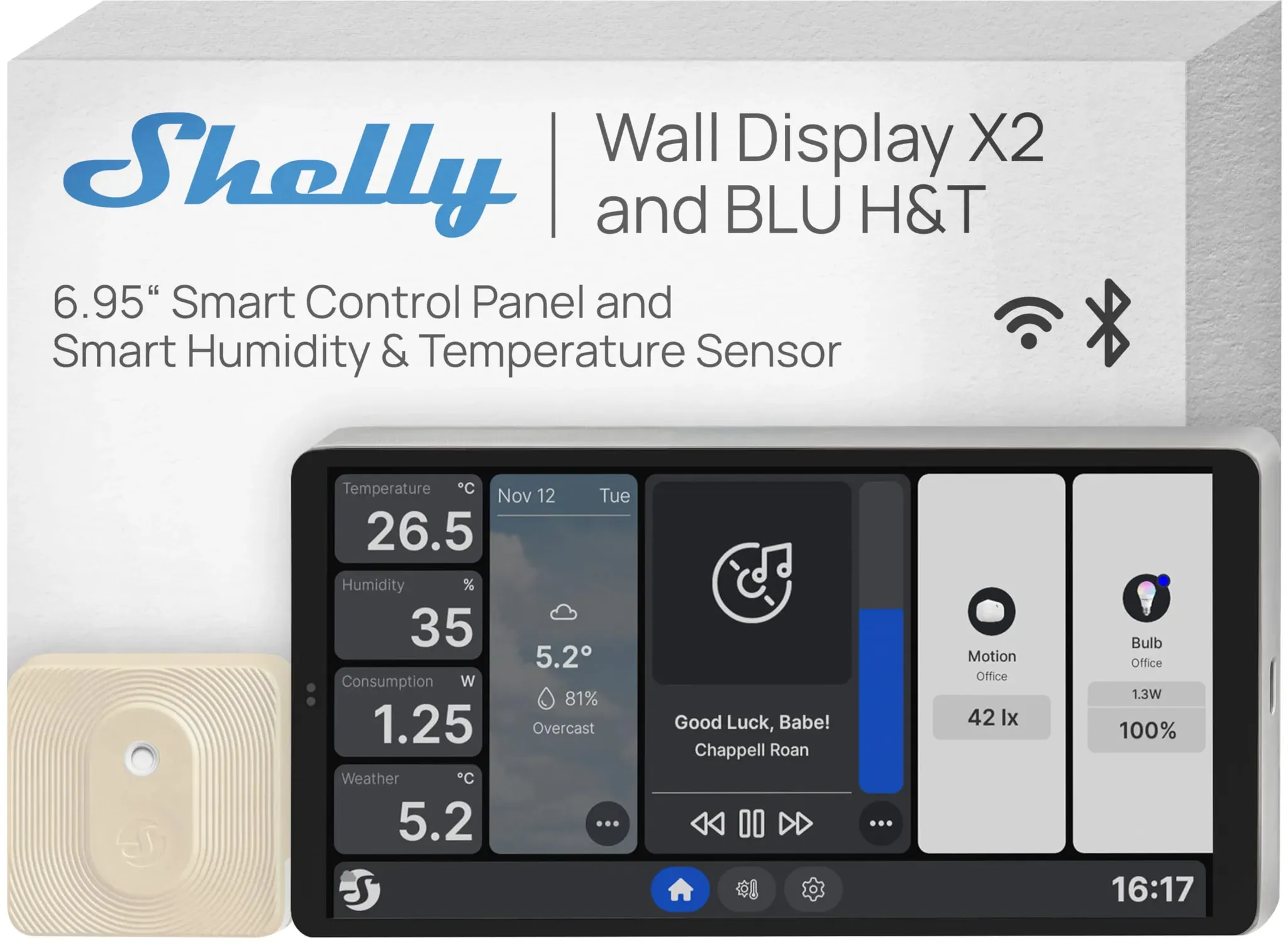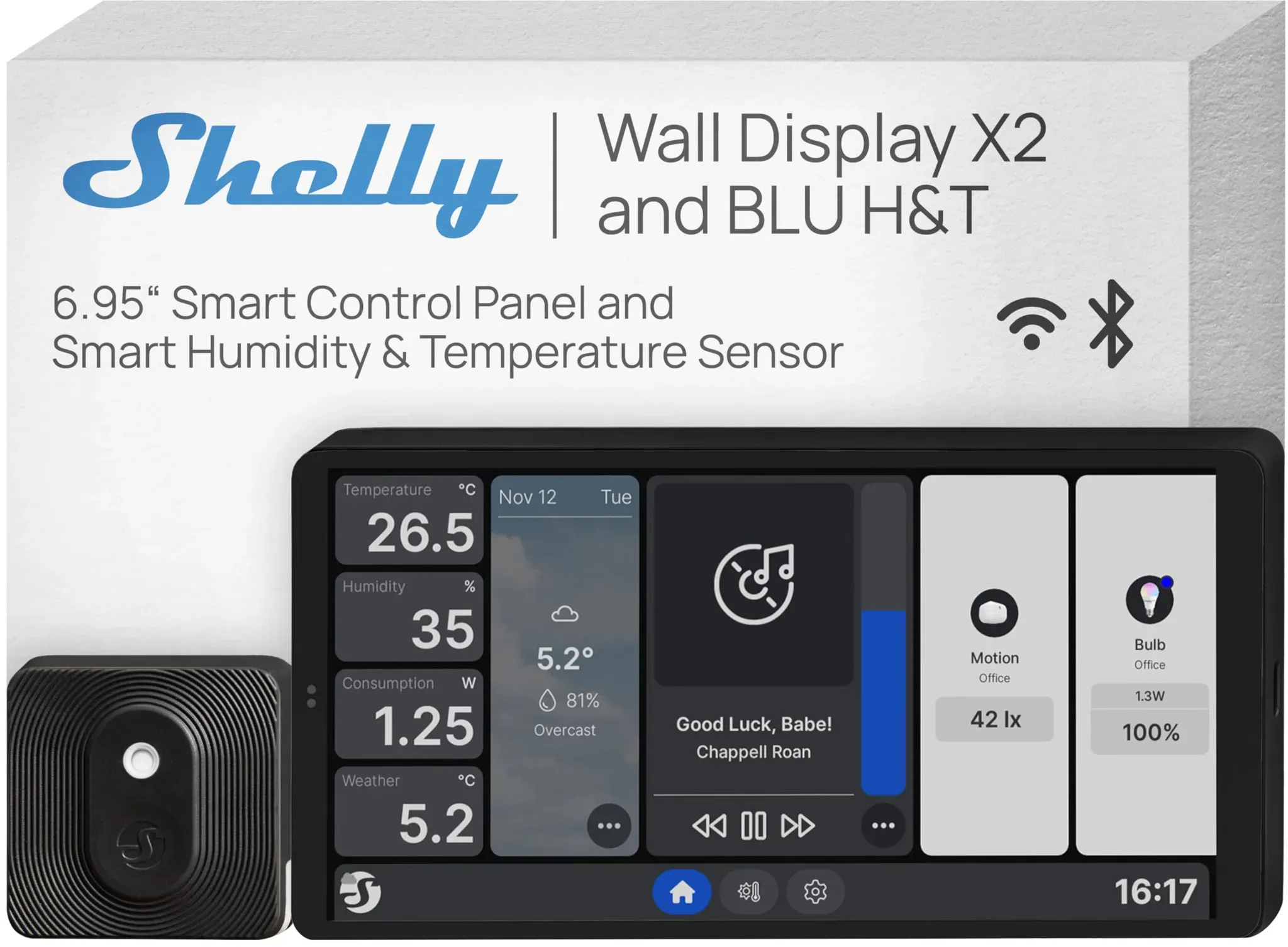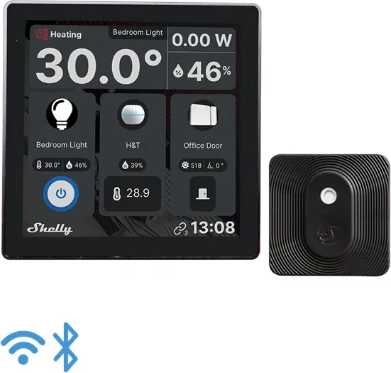 Verfügbarkeit: Auf Lager - Kategorie: Smart Home - Shelly - GTIN:3800238072308 - 6,95-Zoll-Touchscreen-Smart-Steuerungspanel: Verwalte und überwache Dein gesamtes Shelly ökosystem über einen intuitiven 6,95-Zoll-Farb-Touchscreen mit zentralem Zugriff auf Geräte und Szenen Integrated 5A Relay Switch: Replace traditional light switches effortlessly with the built-in 5A relay, enabling direct control of lighting and appliances Built-In Environmental Sensors: Features temperature, humidity, and LUX (light intensity) sensors for real-time environmental monitoring and automation triggers Dual Orientation & Multi-Touch Support: Flexible mounting options allow for portrait or landscape installation, with multi-touch gestures enabling intuitive control over lighting and climate settings Wi-Fi Operated + Quick Setup: Uses 2.4 GHz Wi-Fi for seamless smart home control; Bluetooth included for simplified connection Shelly BLU H&T Included: Comes bundled with a Shelly BLU H&T Bluetooth sensor for instant and accurate room temperature and humidity readings - 179,29 Euro bei Amazon Marketplace Home Improvement - gefunden von billiger.de Dieses Bundle mit dem Shelly Wall Display X2 in Schwarz und BLU H&T Schwarz bietet erweiterte Funktionen und ein größeres Display für umfassende Smart-Home-Steuerung. ![]() ![]() Shelly Wall Display x2 Schwarz + BLU H&T Schwarz (Bundle) - WLAN-Smart-Home-Bedienfeld, Thermostat, Integriertes 5A-Relais, Neutralleiter Erforderlich, Umweltdaten, Steuerzentrale, Alexa & Google Home