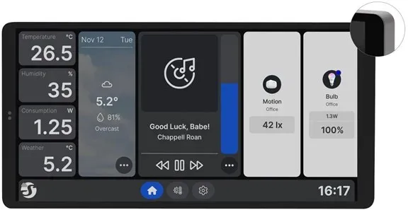 Verfügbarkeit: 6-9 Werktage - Kategorie: Sonstige Komponenten - Shelly - GTIN:3800235264997 - Shelly Wall Display is a 6.95 Android-based touchscreen that provides easy control of your home or office. With a minimalist design, stylish user interface and customizable home screen, Shelly Wall Display will not only fit perfectly into your interior, but will also be adaptable to the needs of the room. The screen is almost double the size of the classic Wall Display and still fits in a standard European socket. It only requires 230V and a WiFi connection to work. The screen is installed in a standard European socket and can be installed both horizontally and vertically. On the devices home screen, you get a quick overview of your favorite devices and scenes. You can also use Shelly Wall Display to control your Bluetooth and Sonos speakers. The Wall Display has a thermostat function and can be used to regulate the temperature in the room. The device also shows the current power consumption, the room temperature and humidity. Like all other Shelly devices, Shelly Wall Display integrates perfectly with more than 200 partner systems, such as Home Assistant, Homey, SmartThings, Google, Alexa and many more. It is also possible to add virtual devices to the screen, which can be used to activate third-party devices through webhooks calls. Shelly Wall Display also has a Home Assistant integration, which makes it possible to display your Home Assistant dashboards directly on the ... Das Shelly Wall Display X2 Black ist ein modernes WLAN-Touchscreen-Bedienfeld für die zentrale Steuerung Ihres Smart Homes. ![]() ![]() Shelly Wall Display X2 Black - WiFi touch screen