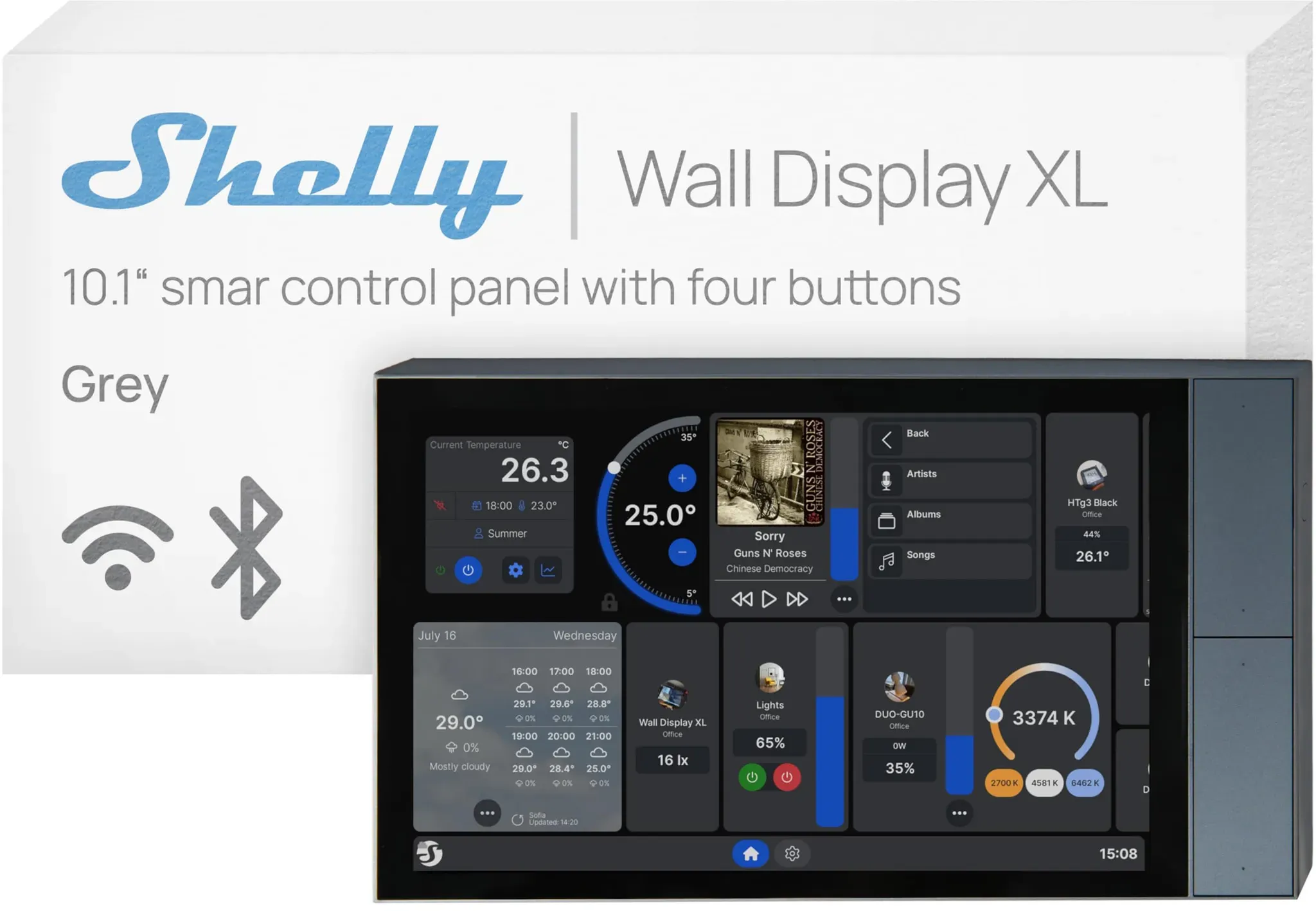 Verfügbarkeit: 1-4 Werktage - Kategorie: Smart Home - Shelly - GTIN:3800238070861 - Shelly Wall Display is a 6.95 Android-based touchscreen that provides easy control of your home or office. With a minimalist design, stylish user interface and customizable home screen, Shelly Wall Display will not only fit perfectly into your interior, but will also be adaptable to the needs of the room. The screen is almost double the size of the classic Wall Display and still fits in a standard European socket. It only requires 230V and a WiFi connection to work. The screen is installed in a standard European socket and can be installed both horizontally and vertically. On the devices home screen, you get a quick overview of your favorite devices and scenes. You can also use Shelly Wall Display to control your Bluetooth and Sonos speakers. The Wall Display has a thermostat function and can be used to regulate the temperature in the room. The device also shows the current power consumption, the room temperature and humidity. Like all other Shelly devices, Shelly Wall Display integrates perfectly with more than 200 partner systems, such as Home Assistant, Homey, SmartThings, Google, Alexa and many more. It is also possible to add virtual devices to the screen, which can be used to activate third-party devices through webhooks calls. Shelly Wall Display also has a Home Assistant integration, which makes it possible to display your Home Assistant dashboards directly on the screen ... Das Shelly Wall Display XL in Silber ist ein Premium-Bedienfeld mit großem Display, Stereo-Lautsprechern und erweiterten Funktionen für ein luxuriöses Smart-Home-Erlebnis. ![]() ![]() Shelly Wall Display XL Silber WLAN-Smart-Home-Bedienfeld, Thermostat, integriertes 5A-Relais, Neutralleiter Erforderlich, LUX-Sensor, Stereo-Lautsprecher, Steuerzentrale, Alexa & Google Home