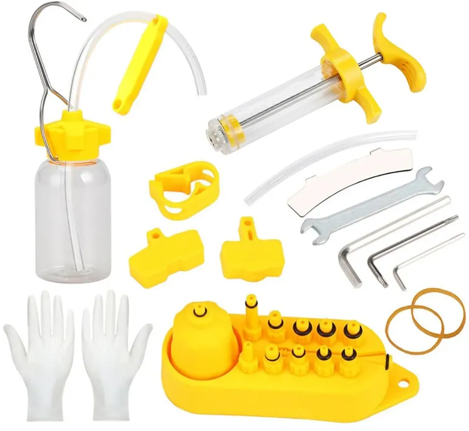 Zustand: Neu - Werkzeugsets Werkzeugsets für Fahrräder - Idezek - 1 QP0JDOHSA4LIOUOG1 - EAN: 0719039884900 - ¥Die Ölspeicherform von Kraftstoffflasche und Trichter kann flexibel auf jede Struktur des Bremsgriffs reagieren. ¥Flexibel reagieren: Das Öl und der Trichter der Fahrradflasche bilden eine Bremsölkonservierung, die flexibel auf die Füllgriffe jeder Struktur reagieren kann. ¥Dieses nützliche Kit macht das Entlüften zu einer einfachen Aufgabe, um Zeit zu sparen. D gehören auch viele Zubehörteile, Clips zum Befestigen des Schlauchs zum einfachen Entlüften, Handschuhe zum Reinigen der Hände usw. Der 7/8-Schraubenschlüssel ist ein guter Helfer zum Installieren oder Entfernen des Entlüftungsschlauchs . ¥Mehrfachverwendung: Sie können den Trichter und den Adapter verwenden, um das Öl durch den Schlauch zu leiten und es sauber und frei von Verunreinigungen in die Flasche zu injizieren. Kompatibel mit Mineralöl und geeignet für DOT-Flüssigkeiten. ¥Das omnidirektionale Anschlusskit kann gleichzeitig an die Ölflasche und die Spritze angeschlossen werden und ist sogar mit vielen Hebe- und Vorderradgabelölfüllungen kompatibel. - Verkäufer: culatecir im amazon.de Marketplace ![]() ![]() Idezek Fahrrad Entlüftungs Kit Professionelle Fahrrad Hydraulische Scheibenbremse Entlüftungsset Mineralöl Entlüften Repair Tool für Shimano, SRAM, MAGURA oder Tektro und andere hydraulische