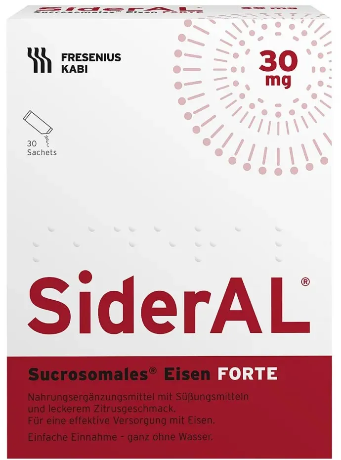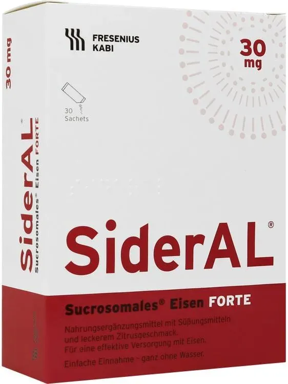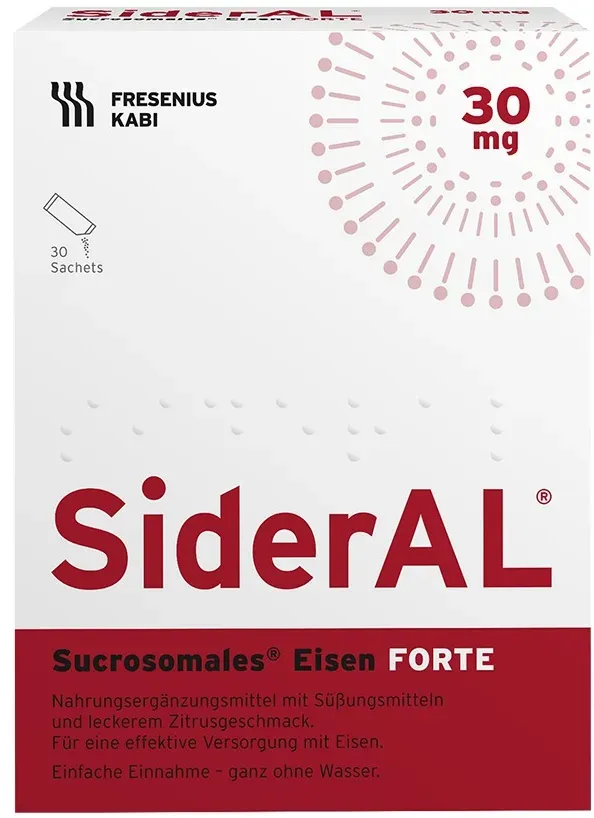 Verfügbarkeit: 1-2 Werktage - 0,62 €/St - Kategorie: Nahrungsergänzungsmittel - Fresenius Kabi - GTIN:4051895024837 - PZN:17543650 - SiderAL Eisen Forte 30mg Zitrus 30 St - rezeptfrei - von Fresenius Kabi Deutschland GmbH - Granulat - 30 St - 18,49 Euro bei DocMorris Apotheke - gefunden von billiger.de ![]() ![]() Fresenius Kabi Deutschland GmbH SiderAl Eisen Forte 30 mg Zitrus bei erhöhtem Eisenbedarf 17543650