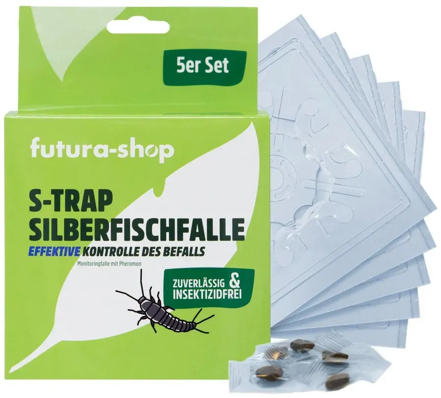 Kategorie: Pflegemittel & Schädlingsbekämpfung - green guardia - GTIN:4260707478397 - UMWELTFREUNDLICH & CHEMIEFREI: Unsere Silberfische Klebefalle ist 100 % giftfrei und sicher für Mensch und Tier ideal, um Silberfische nachhaltig zu bekämpfen. LANGLEBIGE WIRKUNG: Der integrierte Lockstoff macht diese Silberfische Falle bis zu 12 Wochen wirksam und schützt Ihr Zuhause dauerhaft. EINFACHE HANDHABUNG: Kein separates Einlegen nötig Klebefläche einsetzen, Falle aufstellen und Silberfische bekämpfen ohne Chemie oder unangenehme Gerüche. WIEDERVERWENDBAR & FLEXIBEL: Nutzen Sie unsere klebefallen Silberfische immer wieder tauschen Sie nur die Klebeflächen aus und setzen Sie sie als Silberfische Köder ein. UNSICHERER BEFALL?: Senden Sie uns Ihre Silberfische falle Innenbereich zur Insektenbestimmung. Erhalten Sie eine genaue Analyse, welche Schädlinge vorliegen und wie Sie vorgehen können. - 16,90 Euro bei Amazon Marketplace Lawn & Garden - gefunden von billiger.de Das 5er-Set Futura-Shop Insektenfallen für 16,95 Euro nutzt Pheromone und ist speziell für Silberfischchen, Papierfischchen und Ofenfischchen konzipiert. ![]() ![]()