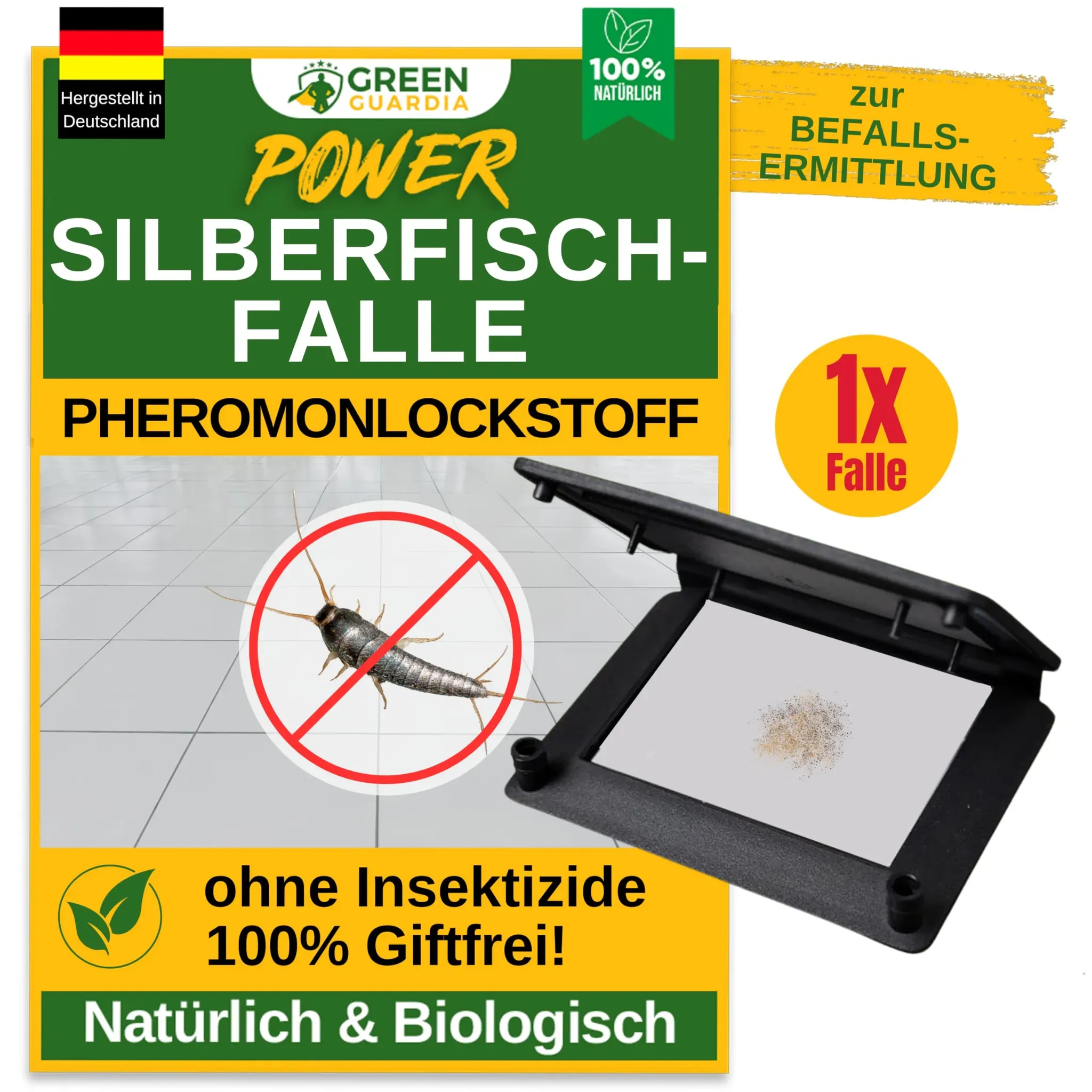 Kategorie: Pflegemittel & Schädlingsbekämpfung - green guardia - GTIN:4260707476645 - UMWELTFREUNDLICH & CHEMIEFREI: Die Silberfische Falle ist 100 % giftfrei und sicher für Mensch und Tier ideal zur nachhaltigen Schädlingsbekämpfung. LANGANHALTENDE WIRKUNG: Der integrierte Spezial-Lockstoff bleibt bis zu 12 Wochen aktiv und schützt Ihre Wohnräume langfristig vor Silberfischen. EINFACHE HANDHABUNG: Die Insektenfalle ist sofort einsatzbereit einfach aufstellen und Silberfische bekämpfen, ohne separate Lockstoffe einzulegen. DISKRETE & FLEXIBLE PLATZIERUNG: Dank der Häuschen-Form lässt sich die Falle unauffällig in Badezimmern, Küchen oder Kellerräumen platzieren für eine effektive Bekämpfung. WIRKSAME BEFALLSüBERWACHUNG: Die Falle hilft nicht nur bei der Bekämpfung, sondern ermöglicht auch eine frühzeitige Erkennung so können Maßnahmen rechtzeitig ergriffen werden.Die Green Guardia Silberfische-Falle mit Spezial-Lockstoff ist eine umweltfreundliche und chemiefreie Lösung zur gezielten Schädlingsbekämpfung. Ob in privaten Haushalten oder in gewerblichen Bereichen diese diskrete Klebefalle hilft Ihnen, Silberfische zuverlässig zu identifizieren und ihre Vermehrung zu stoppen.Dank des bereits integrierten Spezial-Lockstoffs müssen keine separaten Köder eingesetzt werden. Silberfische werden angelockt, bleiben auf der hochwirksamen Klebefläche haften und können sich nicht weiter fortpflanzen. So erkennen und kontrollieren Sie einen Befall schnell und effektiv.Hinweis: Die Falle ... Diese einzelne Pheromonfalle von GREEN GUARDIA für 16,90 Euro ist eine umweltfreundliche und chemiefreie Option mit austauschbaren Klebeflächen. ![]() ![]() GREEN GUARDIA Silberfisch Falle mit Pheromon-Lockstoff - 1x Falle - umweltfreundlich Silberfische bekämpfen, Chemiefreie Pheromonfalle mit austauschbaren Klebeflächen, giftfrei