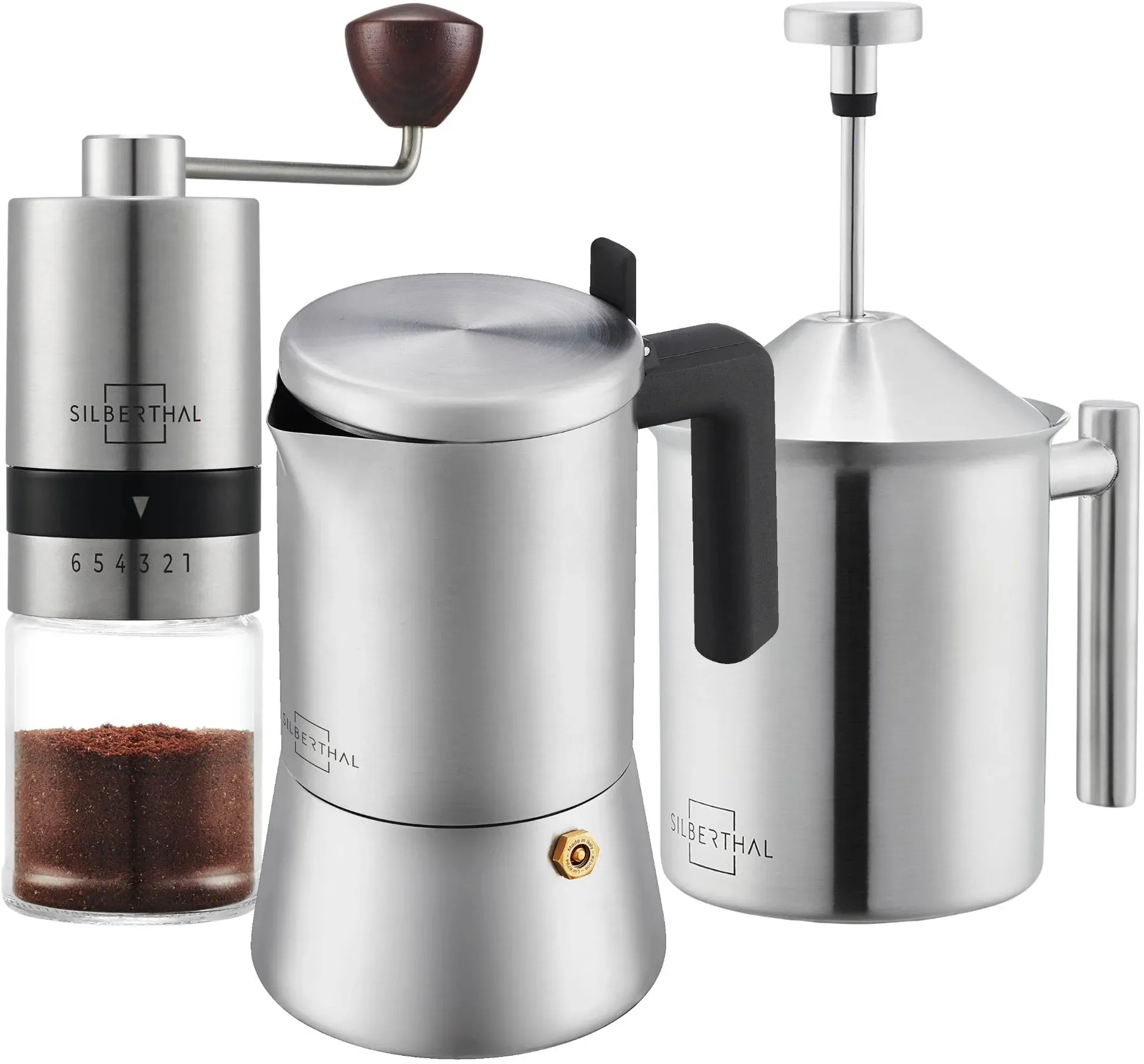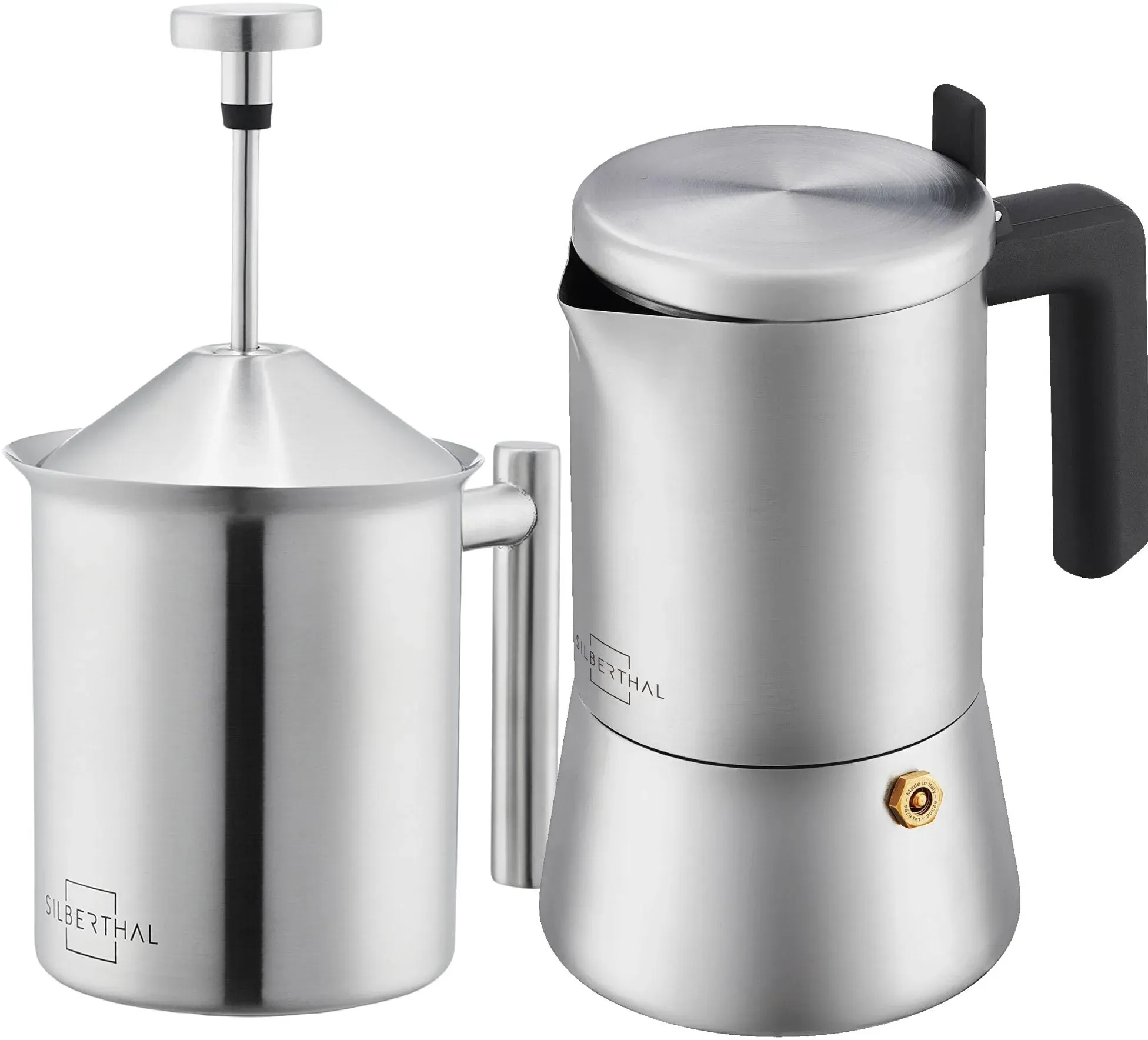 Kategorie: Kaffeebereiter - SILBERTHAL - GTIN:4260470466638 - Italienischer Genuss für zuhause zaubere bis zu 6 Tassen aromatischen Espresso wie im Caf , geeignet für alle Herdarten. Vollmundiges Aroma das Edelstahlsieb lässt die feinen Aromen durch und hält Rückstände zurück, für ein reines Geschmackserlebnis. Sicher & unkompliziert mit kühlem Griff, Sicherheitsventil und müheloser Reinigung wird jede Zubereitung entspannt. Cremiger Milchschaum im Handumdrehen mit dem manuellen Aufschäumer gelingt luftiger Schaum für 2 3 Cappuccini in nur 15 Sekunden. Vielseitiger Genuss heiße oder kalte Milch, spülmaschinenfeste Reinigung und robustes Design machen ihn zum Alltagsliebling. - 69,90 Euro bei Amazon Marketplace Kitchen - gefunden von billiger.de ![]() ![]() SILBERTHAL Großes Geschenkset 3 teilig - Espressokocher 300 ml mit manuellem Milchaufschäumer Edelstahl, manueller Kaffeemühle - Perfektes Geschenkset für Kaffeeliebhaber & Baristas