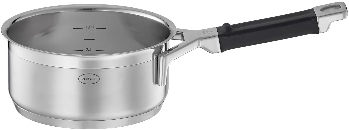 lieferbar-in 4-5 Werktagen bei dirRösle RöSLE Kasserolle SILENCE PRO, Edelstahl 18/10 (1-tlg), Universaltopf mit Innenskalierung, 16 cm, Induktion schwarz|silberfarben