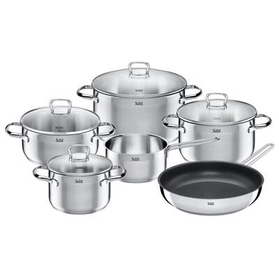 Silit - EAN: 04004633287872 - Die ganze Schönheit der italienischen Küche spiegelt sich im Design des 6-teiligen Topf-Sets von Silit wider, ihre Vielseitigkeit manifestiert sich in einer modernen ästhetik aus satinierten Oberflächen und hochglanzpoliert herausgearbeiteten Details, ihre Einfachheit in der klaren Formensprache der Töpfe. Die hochwertigen und hitzebeständigen Glasdeckel der Fleisch- und Bratentöpfe ermöglichen beim Kochen jederzeit einen Blick ins Topfinnere, die breiten Schüttränder das tropflose Ausgießen von Flüssigkeiten. Gefertigt aus strapazierfähigem und gleichzeitig elegantem Edelstahl 18/10, verfügen die Töpfe und die Pfanne außerdem über den Silitherm -Allherdboden mit optimaler Wärmeverteilung und -speicherung für energiesparendes Kochen. Alle Töpfe und die Pfanne des Sets sind induktionsgeeignet und dürfen inklusive der Deckel zur Reinigung in die Spülmaschine. - bei wmf.com - aus Yadore Produktdaten ![]() Silit Scalea Kochgeschirr-Set, 6-teilig
