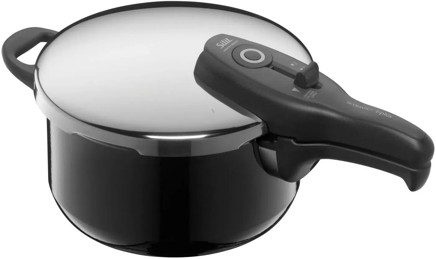Küchenkleingeräte Wohnen - - Der Silit Sicomatic t-Plus Schnellkochtopf bietet unendliche Möglichkeiten, außergewöhnliches Design und hochwertige Materialien für schnelle und gesunde Zubereitungen köstlicher Speisen - egal ob für das Abendessen mit der Familie unter der Woche oder für Partyportionen mit Freunden und Bekannten. Gefertigt aus natürlichem, widerstandsfähigem, kratz- und abriebfestem Silargan®, das zu 100 % frei von Nickel ist, sorgt er für Kochergebnisse voller authentischen Geschmacks. Drei Kochstufen ermöglichen absolute Präzision beim Kochen, die clevere Bedienung sorgt für höchsten Komfort und das 5-stufige Sicherheitssystem für sorgenfreies Kochvergnügen. Hergestellt von und bei Silit in Deutschland., Material: Material Topf: Silargan, Materialeigenschaften Topf: geschmacksneutral, rostfrei, schnitt-/kratzfest, Material Deckel: Edelstahl 18/10, Material Griffe: Kunststoff, Produktdetails: Herdart: Elektro, Gas, Glaskeramik-Kochfeld, Induktion, Fassungsvermögen: 2,5 l, Art Boden: Stahlkern, Art Griffe: Stielgriffe, Gegengriff, Pflegehinweise: teilweise spülmaschinengeeignet, Fassungsvermögen Schnellkochtopf: 2,5 l, Hersteller 3 gemäß den -Bedingungen, Farbe: schwarz, Lieferumfang: 1x Dampfkochtopf ohne Korbeinsatz mit Deckel und Dichtungsring, Maße Gewicht: Durchmesser: 18 cm, Wissenswertes: Herstellungsland: Made in Germany, - Versandkostenfrei: false - Lieferzeit: 3 Tage - product_flag_accessory_wohnen: true - Sofort verfügbar: true - ... Dieser 4,5l Schnellkochtopf aus Edelstahl mit Silarganbeschichtung ist eine solide Wahl für den täglichen Gebrauch. ![]() Silit Sicomatic t-Plus Schnellkochtopf, Edelstahl, 4.5 L, Silarganbeschichtung, schwarz