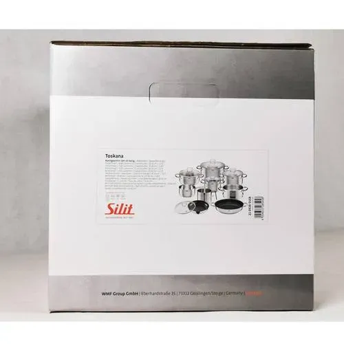 Silit - EAN: 4004633285458 - Silit Topfset 10-tlg. 'TOSKANA' zur Vollausstattung. Mit dem Silit Topfset 10-tlg. 'TOSKANA' wird Ihre modern eingerichtete Küche komplett. Das bewährte Design aus hochwertigem mattsilbernem Edelstahl ist auf allen gängigen Kochfeldern verwendbar sowie backofen- und spülmaschinenfest. Zum hochwertigen Set (Gewicht 11,3 kg) gehören drei Kochtöpfe (zu 16 cm, 20 cm und 24 cm), ein Bratentopf ( 20 cm), eine Stielkasserolle ( 16 cm) sowie zwei antihaftbeschichtete Pfannen und fünf Glasdeckel. Als weiteres Zubehör erhalten Sie noch einen Milchtopf ( 14 cm ohne Deckel) sowie ein Dämpfeinsatz ( 20 cm). Kaufen Sie das Silit Topfset 10-tlg. 'TOSKANA'! - bei zurbrueggen.de - aus Yadore Produktdaten ![]() ![]() SILIT Kochtopf - Set Topfset eBay Toskana Sonderedition 10tlg.