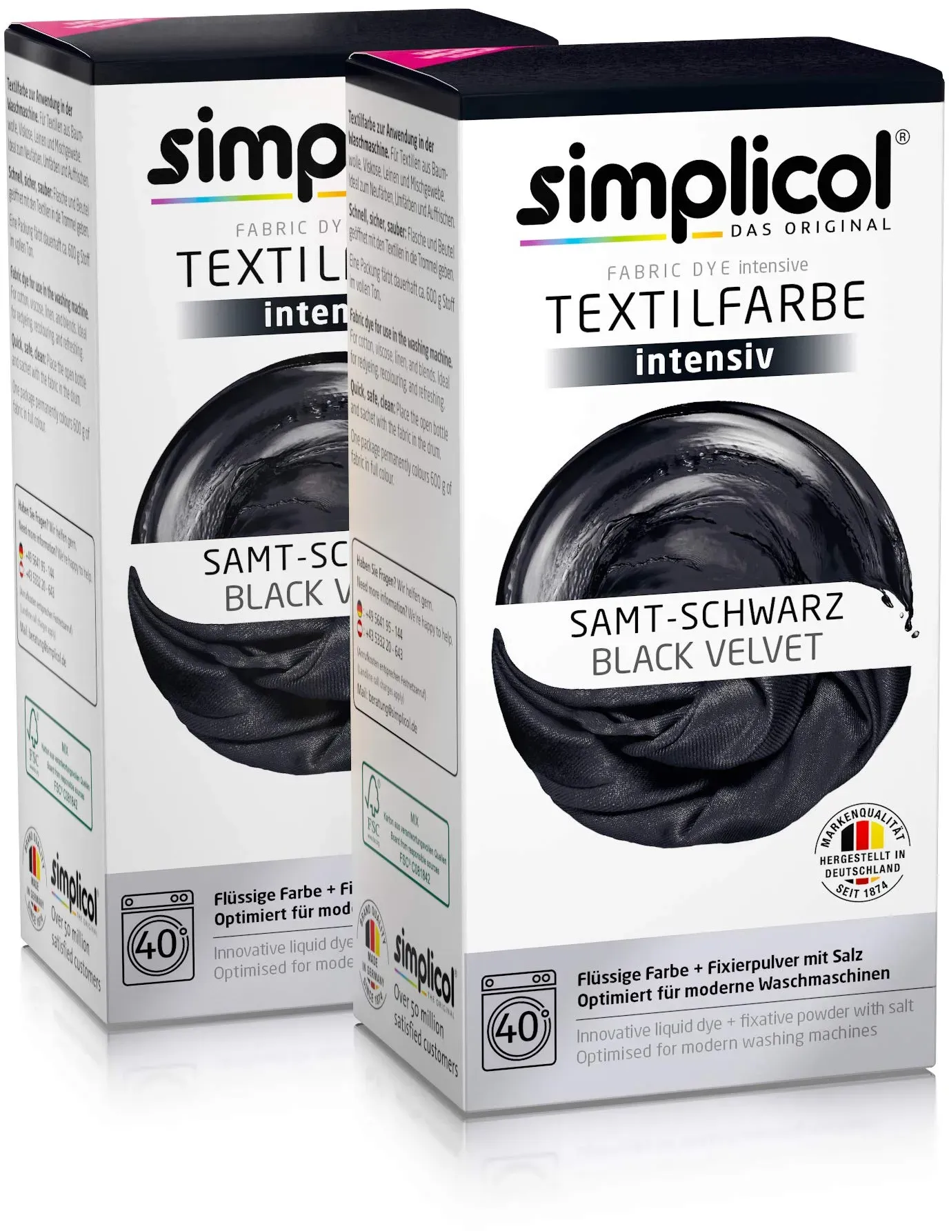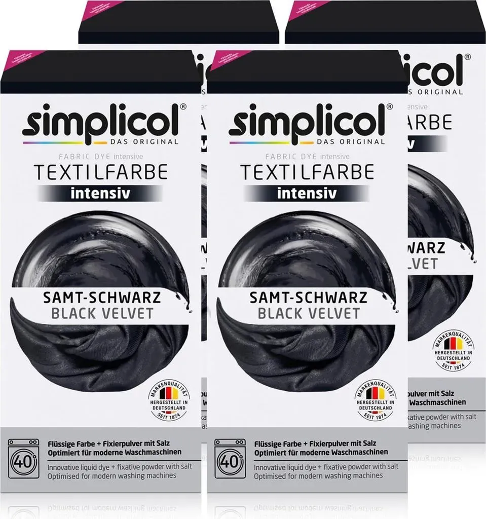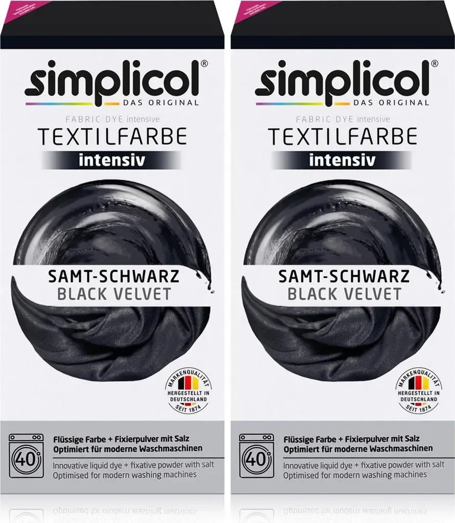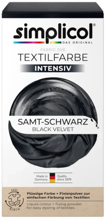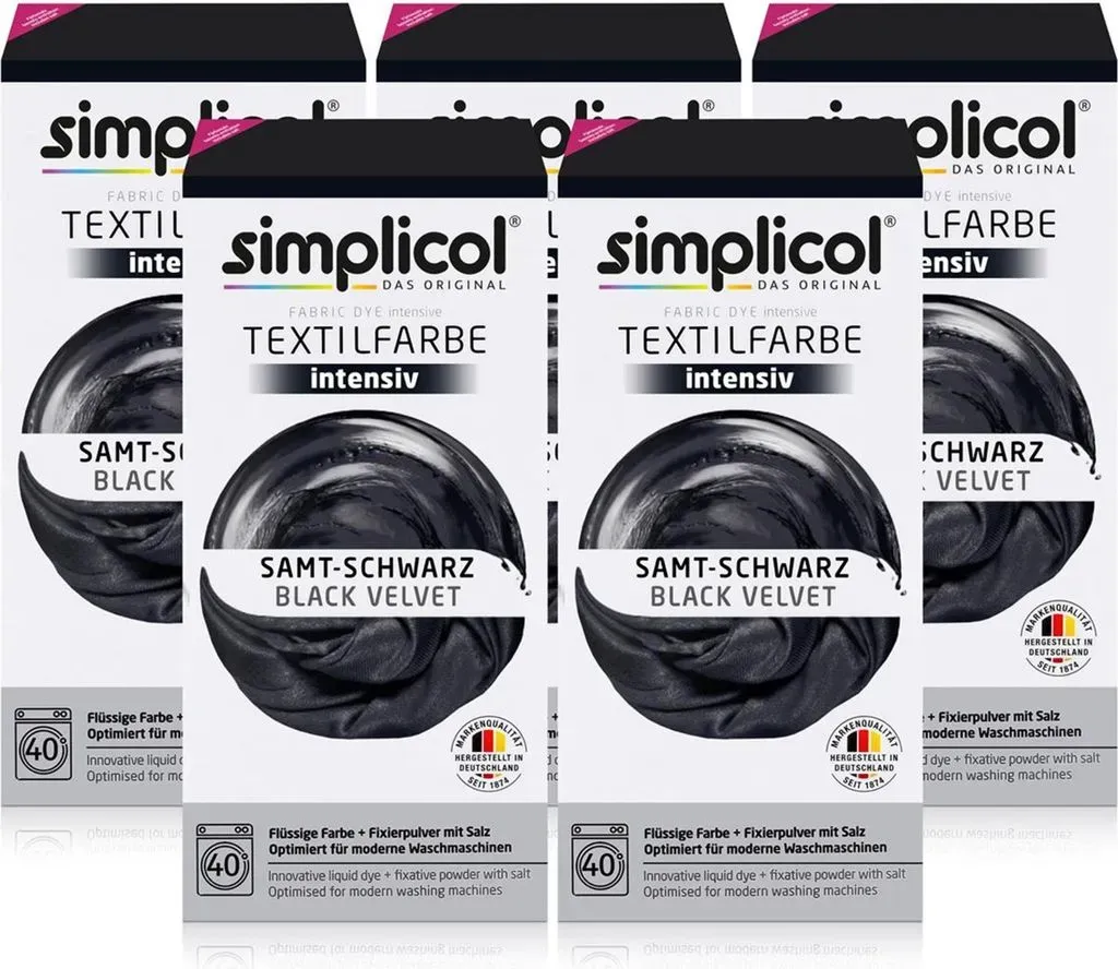 Zustand: Neu - 11,65 € / kg - Textilfarben - simplicol Brauns-Heitmann GmbH & Co.KG - 1818 - EAN: 4052400018181 EAN: 4052400125186 - INTENSIVES SAMT-SCHWARZ: Verleihe deiner Kleidung und Heimtextilien mit der simplicol Textilfarbe intensiv einen neuen, leuchtenden Look VIELSEITIG EINSETZBAR: Die simplicol Textilfarbe intensiv ermöglicht das Neufärben, Umfärben und Auffrischen deiner Textilien und ist geeignet für Baumwolle, Viskose, Leinen sowie Mischgewebe EINFACHE ANWENDUNG IN DER WASCHMASCHINE: Die flüssige Textilfarbe wird bei 40 °C direkt in die Trommel gegeben und sorgt für eine gleichmäßige, brillante Färbung ohne Flecken KOMPLETTPACKUNG: Die flüssige Farbe löst sich sofort auf, ist sicher für Maschine und Textil und rt eine gleichmäßige Färbung - der Farbfixierer sorgt für langanhaltende Ergebnisse DAUERHAFT BRILLANTE FARBEN: Die Farbe bleibt waschecht bis 95 °C und sorgt für langanhaltende, intensive Farbergebnisse - bei Amazon.de Dieses Angebot ist eine preiswerte Option für eine All-in-1 Textilfarbe, die rückstandsfrei färbt. ![]() ![]() Simplicol TEXTILFARBE - SAMT SCHWARZ eBay färbt rückstandsfrei All in1 intensive Farben