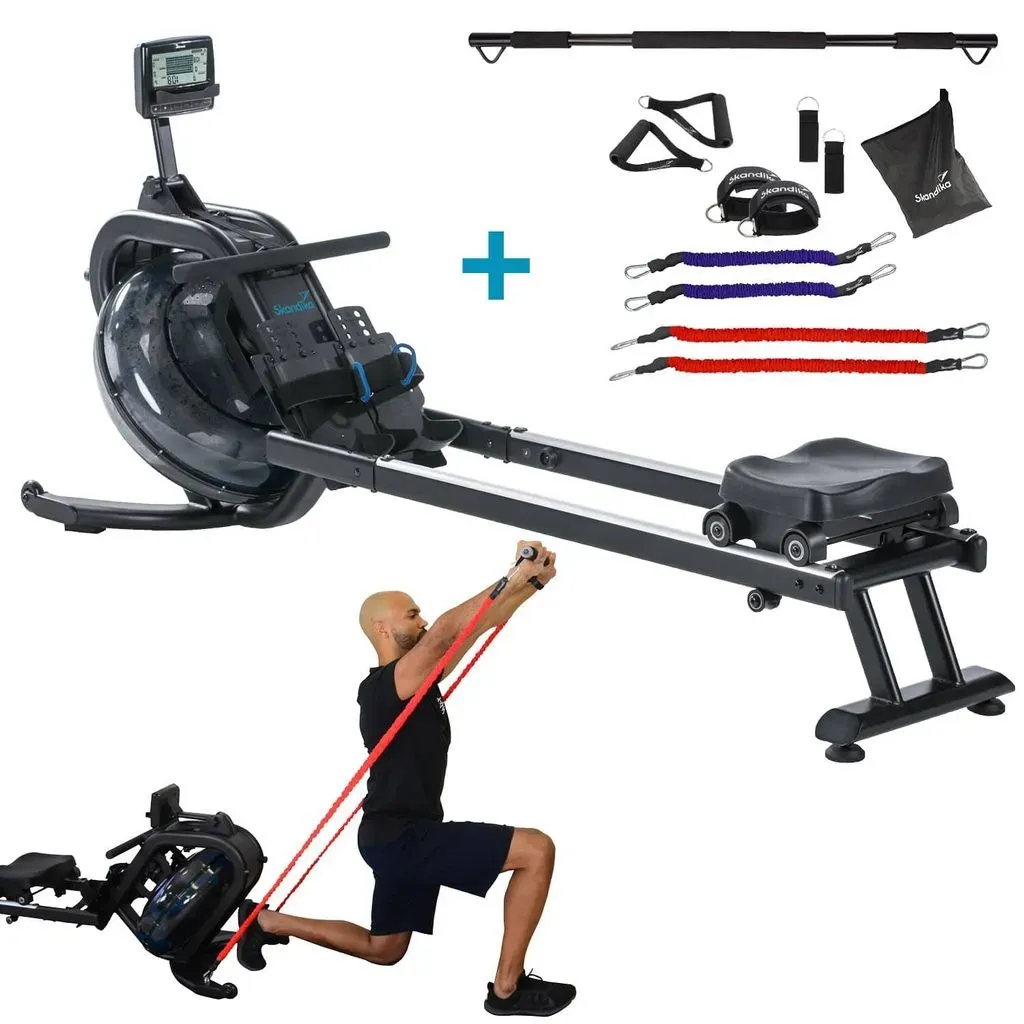 Verfügbarkeit: 3-4 Werktage - Kategorie: Rudergeräte - Skandika - GTIN:4260709567570 - Nun auch im Set erhältlich: Unser Top-Seller Wasserrudergerät Nemo IV, zusammen mit dem Skandika Multi-Widerstandbänder-Set. Eine unschlagbare Kombination für das perfekte Ganzkörper-Workout. Es handelt sich also um ein Trainingsgerät von hoher Qualität und Langlebigkeit €“ der ideale Heimtrainer für ein effektives Training zu Hause.Die besondere 45° Tank Technologie des Nemo IV erzeugt einen höheren Widerstand und ermöglicht so ein noch effektiveres Training. Das Gerät verbindet das effektive Rudererlebnis mit dem beruhigenden Geräusch des Wassers und sorgt so für ein naturnahes Workout mit einem flüssigen Bewegungsablauf.Der Widerstand beim Rudern ergibt sich zum einen durch die Wasser-Füllmenge und zum anderen durch den Kraftaufwand, der beim Ruderzug aufgebracht wird. Der Wassertank ist aus bruchsicherem Kunststoff gefertigt und fasst bis zu 14 L.In Kombination mit den Skandika Multi-Widerstandsbändern ergeben sich nun wesentlich mehr Trainingsoptionen für das Nemo IV. Die Karabinerhaken an den Bändern werden einfach in die Metallösen am Standfuß des Rudergeräts eingehakt und können dann für die sichere Ausübung einer Vielzahl an übungen eingesetzt werden.Das umfangreiche Zubehör der Widerstandsbänder mit der Soft-Grip-Stange, den Handgriffen, den Knöchelmanschetten sowie die unterschiedlichen Längen und Kombinationsmöglichkeiten der Bänder erlauben ... ![]() ![]() Skandika Wasserrudergerät Nemo IV | Wasser Rudergerät für Zuhause, Kinomap, Tablet Halterung, aufstellbar | Rudermaschine mit Wasserwiderstand (Set)