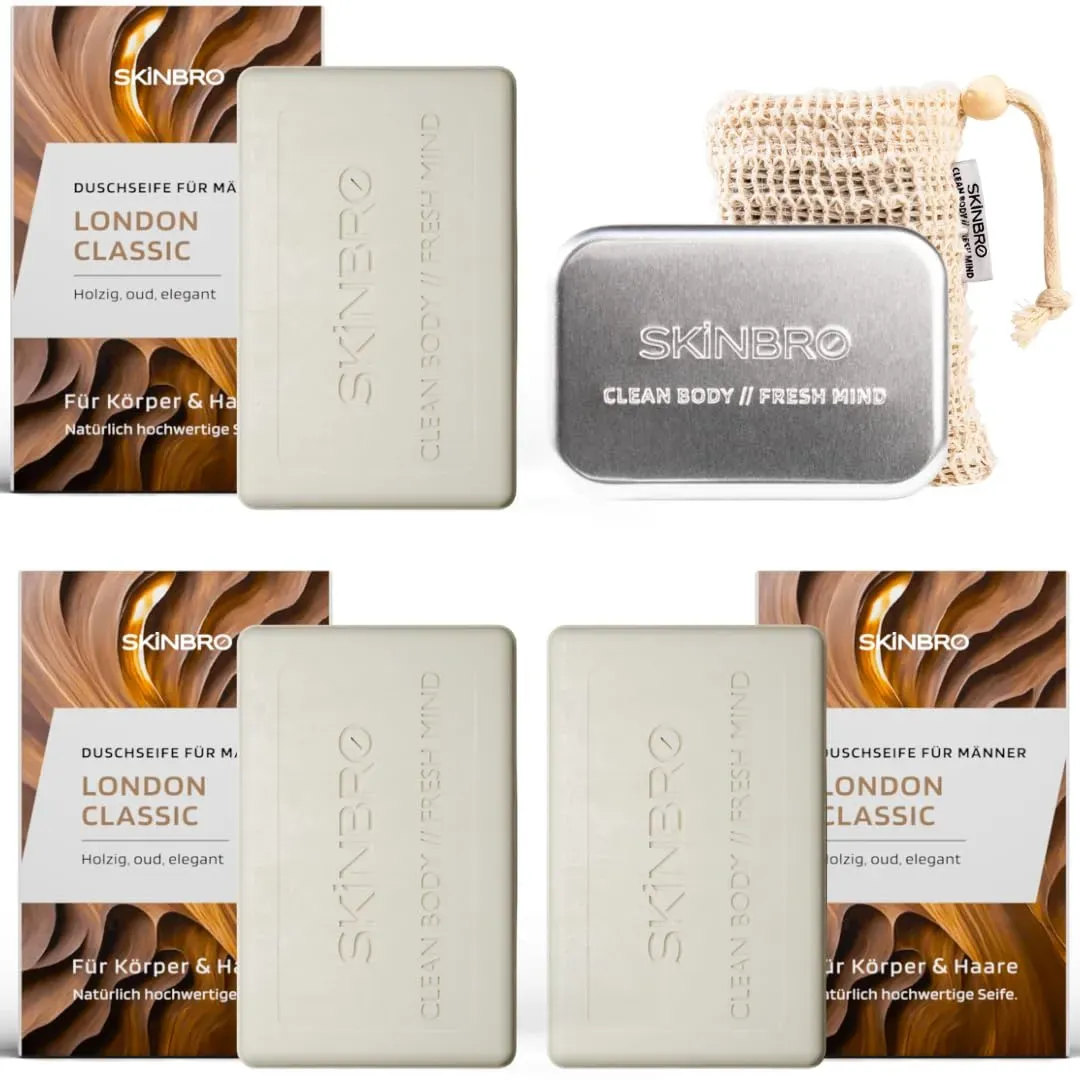 Zustand: Neu - 149,97 € / kg - Duschgel - SKINBRO SKINBRO GmbH - - EAN: 4262508930203 - VIELSEITIGE PFLEGE FÜR HAAR, GESICHT & KÖRPER - Die SKINBRO Duschseife reinigt sanft und gründlich. Die vegane, silikonfreie Formel schützt vor Austrocknung - ideal für empfindliche Haut SOMMERLICHER ZITRUSDUFT - FRISCH, FRUCHTIG, BELEBEND - Der spritzige SKINBRO Santorini Dream Duft mit Zitrone und Orange bringt pure Sommerfrische unter die Dusche. Fruchtig-frisch und belebend wie ein sonniger Tag am Meer, sorgt das feste Duschgel für ein erfrischendes Duscherlebnis. Ideal für aktive Männer, die Wert auf natürliche Frische und ein langanhaltend sauberes Hautgefühl legen ERGIEBIG & IDEAL FÜR UNTERWEGS - Dank kompakter Größe & Aluminium-Seifendose perfekt für Reisen. Das Set enthält ein Sisalsäckchen zum einfachen Aufschäumen EINFACHE ANWENDUNG & LANGANHALTEND - Direkt auf die Haut auftragen oder aufschäumen. Für mehr Schaum ins Sisalsäckchen geben. Bis zu 120 Anwendungen pro Set MADE IN GERMANY - UMWELTFREUNDLICH & NACHHALTIG - SKINBRO Pflegeprodukte sind plastikfrei verpackt, vegan & frei von Silikonen und Parabenen - für eine nachhaltige Körperpflege - Verkäufer: SKINBRO im amazon.de Marketplace ![]() ![]() SKINBRO Duschset Männer London Classic 3x feste Duschseife (je 100g), elegant & holzig mit Oud, inkl. Sisalsäckchen & Alu-Seifendose Silikonfrei, vegan & nachhaltig Made in Germany