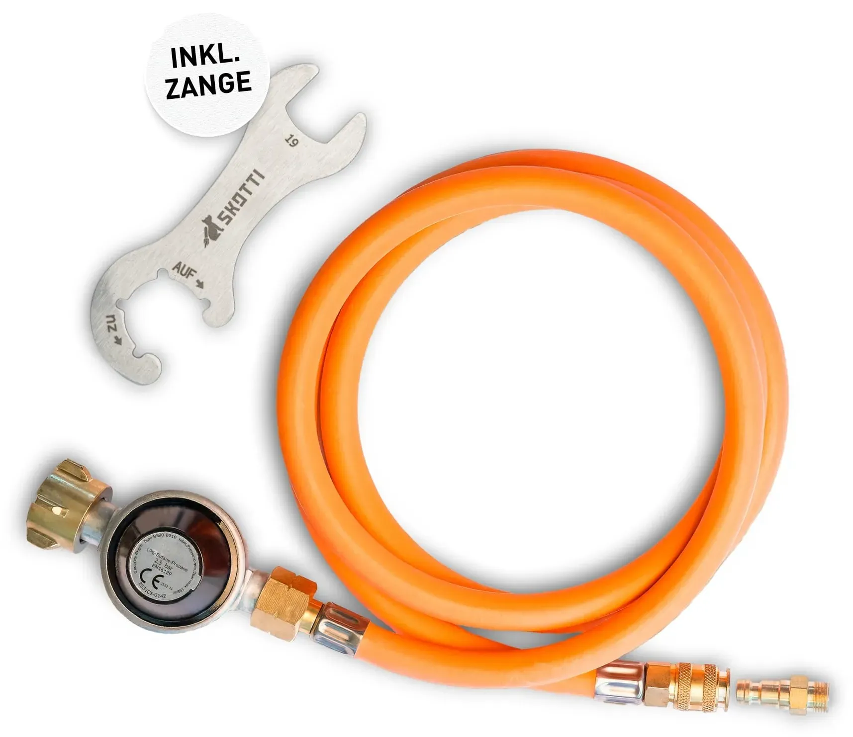 Auf Lager Versand durch AmazonSKOTTI Prop, EN 417 Gaskartuschen kompatibel, Gasflaschenanschlussset für SKOTTI Grill und Campingkocher, für große Gasflasche 5kg und 11kg, ideal für Camping & Outdoorkocher, 150cm länge