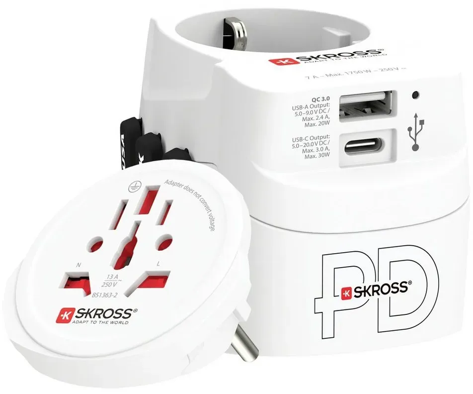 Verfügbarkeit: Auf Lager - Kategorie: Steckdosen - SKROSS - GTIN:7640166329107 - Der kompakte universelle 3-Pin-Reiseadapter mit integriertem Schnelllade-USB-PD-Ladegerät (1 x USB C und 1 x USB). Der PRO Light USB AC45PD - World sorgt für den einfachen und sicheren Anschluss von 2- und 3-poligen Geräten aus aller Welt an mehr als 200 Ziele. Die Leistung beträgt bis zu 1750 W, sodass Sie selbst leistungsstarke Geräte wie Laptops oder Reise-Haartrockner anschließen können. Der Dual-USB-Anschluss bietet ausreichend Strom, um zwei USB-Geräte (1 x USB C und 1 x Standard-USB-Gerät) problemlos aufzuladen, auch wenn gleichzeitig ein anderes Gerät über den Hochleistungsadapter angeschlossen ist. Der integrierte USB-C-Anschluss lädt Laptops und andere Geräte superschnell auf! Eingangsstecker: Schweiz, Italien, Brasilien, Großbritannien, USA/Japan, Australien/China, Europa (Schuko und Euro 2-polig) Ausgangsstecker: USA, Großbritannien, Australien/China, Europa (Schuko) Eingangsspannung: 100 €“ 250 V AC, 50/60 Hz Maximal. Belastung: 7 A Nennleistung: 100 V AC €“ 700 W / 250 V €“ 1750 W Austauschbare Sicherung: T 7 A 1 x USB Typ-C Ausgang: 5,0 V DC/max. 3,0 A, maximal 15,0 W, 9,0 V DC/maximal. Maximal 3,0 A. 27,0 W, 15,0 V DC/max. Maximal 3,0 A. 45,0 W, 20,0 V DC / Maximum. Maximal 2,25 A. 45,0 W 1 USB-Typ-A-Ausgang: 5,0 V DC/max. 2,4 A, maximal. 12,0 W, 9,0 V DC / max. 2,22 A, maximal. 20,0 W €“ Dual-Port-Ausgang (A+C): 5,0 V DC/max. 4,8 A, (24,0 W) geteilt ... Ein kompakter und leistungsstarker Reiseadapter mit AC30PD Schnellladefunktion, ideal für moderne Geräte. ![]() ![]() SKROSS Skross 1.302473 Reiseladegerät PRO Light USB AC30PD World Reiseadapter