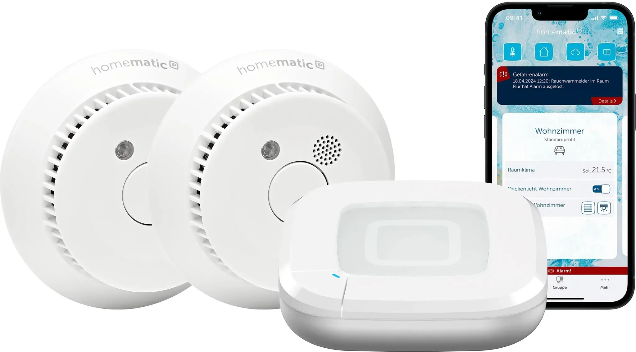 Kategorie: Smart Home - eQ-3 - GTIN:4251297396642 - Homematic IP Smart Home Starter Set Rauchmelder für 2 Räume Der Homematic IP Rauchwarnmelder mit Q-Label alarmiert zuverlässig bei gefährlichem Rauch und vernetzt alle Melder in deinem Zuhause. Intelligente Sicherheit, die Leben schützt smart, verlässlich und stets einsatzbereit. Zuhause und unterwegs immer sicher alarmiert mit dem Rauchwarnmelder von Homematic IP: Die vernetzten Rauchwarnmelder mit Q-Label Qualitätskennzeichen schlagen bei Raucherkennung sofort Alarm und kommunizieren untereinander im gesamten Haus. Rauchwarnmelder mit Q-Label HmIP-SWSD-2 Der Homematic IP Rauchwarnmelder mit Q-Label erkennt zuverlässig gefährliche Rauchentwicklungen und alarmiert über ein vernetztes System alle Melder im Zuhause. Damit sorgt er für maximale Sicherheit jederzeit und überall. Zuverlässiger Rauchwarnmelder mit Q-Label für frühzeitige Raucherkennung und umfassenden Schutz. Einfach in bestehende Homematic IP Systeme integrierbar, automatische Vernetzung von bis zu 40 Meldern. Langlebige Batterie mit 1 n Betriebszeit und optionaler LED-Notbeleuchtung für zusätzliche Orientierung. LEBENSRETTER FüR MEHR SICHERHEIT ZUHAUSE UND UNTERWEGSFrühzeitige Erkennung von gefährlichen Rauchentwicklungen und sofortige Alarmierung nicht nur über die laute Sirene, sondern auch in der Homematic IP App. Der Rauchwarnmelder arbeitet nach dem optischen Streulichtprinzip, was ihn besonders zuverlässig und sicher gegen Störungen macht. Durch die ... Dieses 3er-Set ist eine gute Wahl für mittelgroße Wohnungen und bietet eine umfassende Abdeckung. ![]() ![]() eQ-3 Homematic IP Smart Home 3er-Set Rauchwarnmelder mit Q-Label, Rauchmelder alarmiert lokal über die Sirene und per Push-Benachrichtigung in der Smartphone-App, integrierte LED-Notbeleuchtung