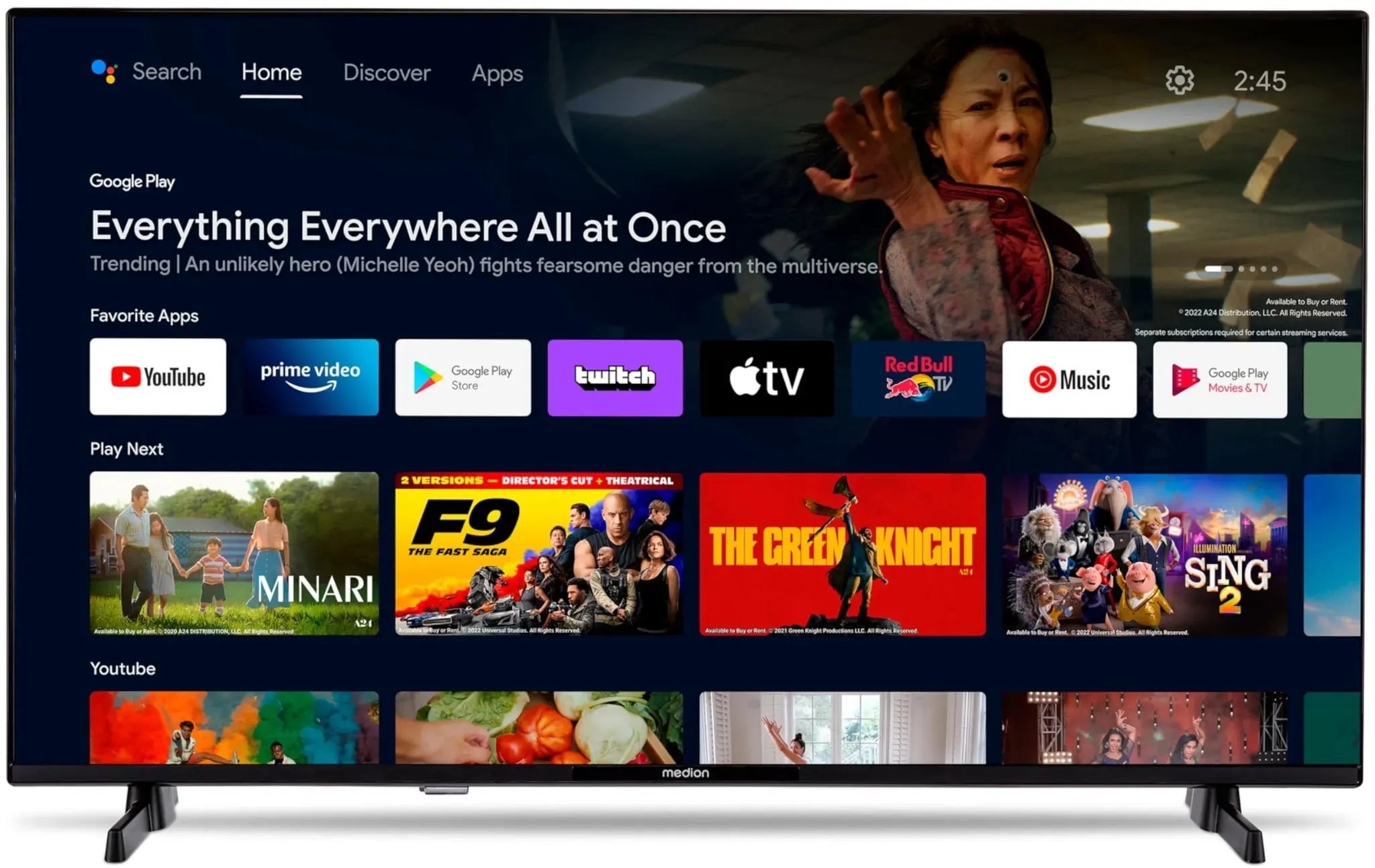 EEK: E - Kategorie: Fernseher - JAY-tech - GTIN:4262395394010 - Leistung, Energieverbrauch & Umwelt Modellbezeichnung , JTCS40F39401SL, Bildschirmdiagonale in Zentimeter , 101,00 cm, Bildschirmdiagonale in Zoll , 40 ', Energieverbrauch im Ein-Zustand bei Standard-Dynamikumfang (SDR) pro 1000 h , 36 kWh, Leistungsaufnahme Stand-by , 0,50 W, Bildschirmauflösung in Pixel , 1920 x 1080 px, Energieeffizienzklasse (Skala) , E (A bis G), Allgemein Fernseherfunktionen , USB-Mediaplayer LCN EPG Untertitel Teletext Kindersicherung Sleep Timer Hotelmodus, Wandhalterungsstandard (VESA) , 200 x 200 mm, Lieferumfang , Fernbedienung 2 x AAA Batterien Standfüße Bedienungsanleitung, TV-Empfang Tunerart , Triple-Tuner, Empfangsstandards , DVB-C DVB-S2 DVB-T2 HD, Bildschirm Auflösungsstandard , Full HD, Herstellerauflösungsstandard , FHD, Bildschirmtechnologie , LED, Bildwiederholfrequenz , 60 Hz, Bildschirmhelligkeit , 250,00 cd/m2, Seitenverhältnis , 16:9, Dynamisches Kontrastverhältnis , 1.000.000:1, Pixel-Reaktionszeit , 8,00 ms, Multimediafunktionen Internetfähigkeit , Smart TV HDR LAN/WLAN DLNA Miracast WiFi Display, Smartfunktionen , HbbTV 2.0 Miracast WiFi Display DLNA WLAN LAN, Betriebssystem / Software Betriebssystem , VIDAA, Netzwerk- und Verbindungsarten Netzwerkstandard , LAN Ethernet WLAN (WiFi), Netzwerkfunktionalität , DLNA WLAN LAN, Anschlüsse Anschlüsse hinten , 3 x HDMI 2 x USB CI+ RF (TV) RF (Satellit) Composite/CVBS + Audio In LAN (RJ45) Optical Kopfhörerausgang, Common ... Das MEDION 100,3 cm (40 Zoll) Full HD Android TV ist eine solide Wahl mit Android TV und PVR-Funktion. ![]() ![]() MEDION 100,3 cm (40 Zoll) Full HD Fernseher (Android TV, Smart TV, HDR, Prime Video, PVR, Bluetooth, MD 840100)
