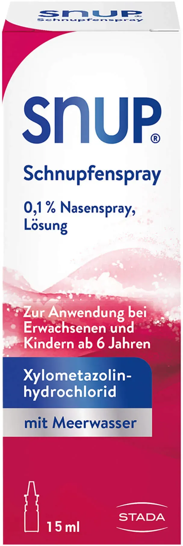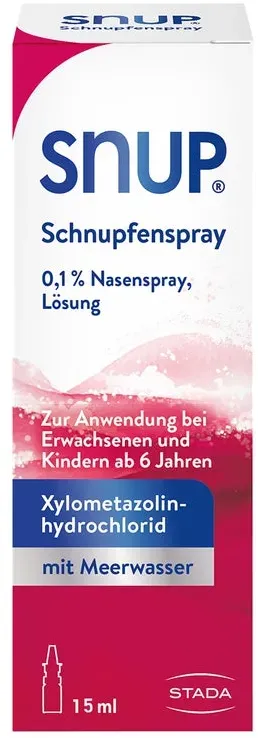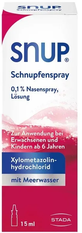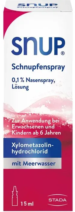 290,67 /l - Kategorie: Arzneimittel - STADA Consumer Health Deutschland GmbH - GTIN:4150044826800 - PZN:04482680 - Wichtige Hinweise (Pflichtangaben): Snup Schnupfenspray 0,1 % Nasenspray, Lösung . Wirkstoff: Xylometazolinhydrochlorid. Anwendungsgebiete: Zur Anwendung bei Erwachsenen und Kindern ab n.... - 4,36 Euro bei Mycare - gefunden von billiger.de ![]() ![]() STADA Consumer Health Deutschland GmbH Snup Schnupfenspray 0,1% 15 ml Nasenspray