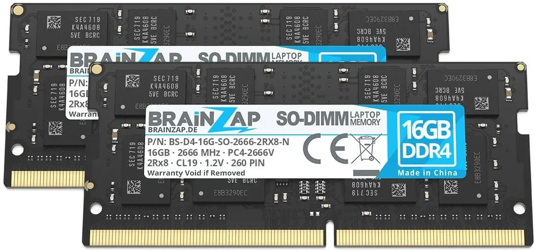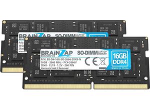 - - Produktbeschreibung Unser 32GB DDR4 RAM Speicherkit besteht aus 2 Modulen mit jeweils 16GB Kapazität mit der Artikelnummer BS-D4-32GK2-SO-2666-2RX8-N läuft mit 1.2V und wird nach höchsten Qualitätstandards hergestellt und überprüft.Die Speicherfrequenz beträgt 2666 MHz und ist abwärtskompatibel zu 2400 MHz, und 2133 MHz.Die Marke BRAINZAP ist bei der JEDEC (Joint Electron Device Engineering Council) registriert und unsere Speichermodule entsprechen zu 100% den JEDEC Spezifikationen. Die Speichermodule sind mit dem JEDEC-Spezifikationen PC4-2666V prorammiert. Die entsprechende Speicherlatenz ist CL19. Die Speichermodule sind für eine maximale Kompatibilität doppelseitig bestückt (Dual-Rank 2Rx8). Die Speichermodule sind Unbuffered und Nicht-ECC und laufen dadurch problemlos in den meisten Geräten.Wir verwenden nur Markenchips (vorzugsweise Samsung, Micron und SK Hynix).Neuer Speicher.Markenchips (Samsung/Hynix/Micron/Kingston)Kompatibel mit den meisten Notebooks mit DDR4 Speicher.Beispielabbildung. Aussehen kann abweichen.Abswärtskompatibel zu 2400 MHz und 2133 MHz Speicher.Produktdetails EAN: 4262360572122Speichertyp: DDR4 RAMMarke: BRAINZAPModellnummer: BS-D4-16G-SO-2666-2RX8-NKompatibel mit: Notebooks - Intel und AMDSpeicher-Frequenz: 2666 MHzModul-Einzelkapazität: 16GBAnzahl Module: 2Gesamtkapazität: 32GBSpeicher-Spezifikation: PC4-2666VJEDEC Norm: PC4-2666VBauform: SO DIMM 260-pol.Unbuffered: jaECC: neinRegistriert: neinSpannung: 1.2VLatenz (CL): 19Chip-Anordnung: ... Dieses 2x 16GB Kit von BRAINZAP bietet eine kostengünstige Möglichkeit, 32GB DDR4-2666 SO-DIMM RAM zu erhalten. ![]() BRAINZAP 32GB DDR4 RAM SO-DIMM PC4-2666V 1Rx8 2666 MHz 1.2V CL19 Notebook Laptop Arbeitsspeicher (2x 16GB) BS-D4-32GK2-SO-2666-N