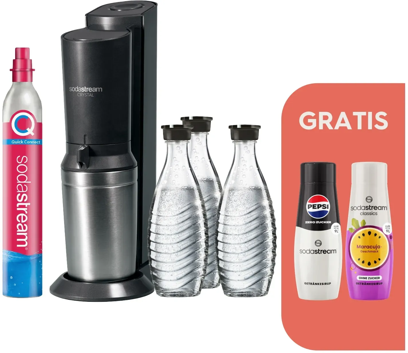 lieferbar-in 4-5 Werktagen bei dirSodaStream Wassersprudler SodaStream CRYSTAL 3.0 mit 3 Glaskaraffen, 1 CO2-Zylinder und 2 Sirups, (Sirups: 1x Pepsi Zero Zucker, 1x Maracuja ohne Zucker), mit Quick-Connect-System schwarz