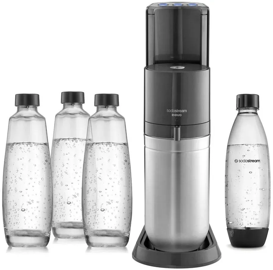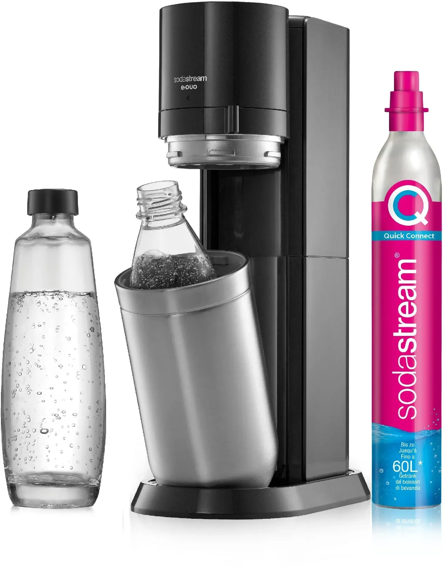 36 Händlerangebote bei billiger.de - Kategorie: Wassersprudler - Sodastream - Wir stellen den Duo vor: Genieße das Beste aus beiden Welten und verwandle gewöhnliches Wasser in Sekundenschnelle in frisches, sprudelndes Wasser oder leckere Erfrischungsgetränke. Elegant und vielseitig, der Duo funktioniert mit Glas- oder Kunststoffflaschen. Besser für dich, besser für den Planeten: Bleibe hydriert und mixe zu Hause gesunde und leckere Getränke, Cocktails und vieles mehr. Weg mit dem Einwegplastik, her mit dem mühelosen Glitzern! Sei die Veränderung: Reduziere deinen Plastikmüll, denn mit unserer Sprudelmaschine kannst du in n bis zu 1.282 Einweg-Plastikflaschen einsparen. Mit Sodastream muss sprudelndes Wasser nicht die Welt kosten. Verwandle Leitungswasser in etwas wirklich Aufregendes: Mit nur einem Knopfdruck köstliches Wasser mit Kohlensäure zubereiten. Darüber hinaus ermöglicht unsere neue Quick-Connect-Technologie ein schnelles und einfaches Einsetzen der CO2-Flasche ohne Drehbewegung. Genieße kohlensäurehaltige Getränke zu Hause oder unterwegs: Das Starterset enthält: 1x 60 l rosa Quick Connect Gasflasche, 1x 1 l spülmaschinenfeste BPA-freie Plastikflasche und 1x 1 l spülmaschinenfeste Glasflasche/Karaffe. - GTIN:8719128118352 Dieser SodaStream Duo Wassersprudler in Titan-Farbe ist ein Standardmodell zu einem soliden Preis, ideal für alle, die ein zuverlässiges Gerät suchen. ![]() ![]() SODASTREAM DUO Wassersprudler Titan