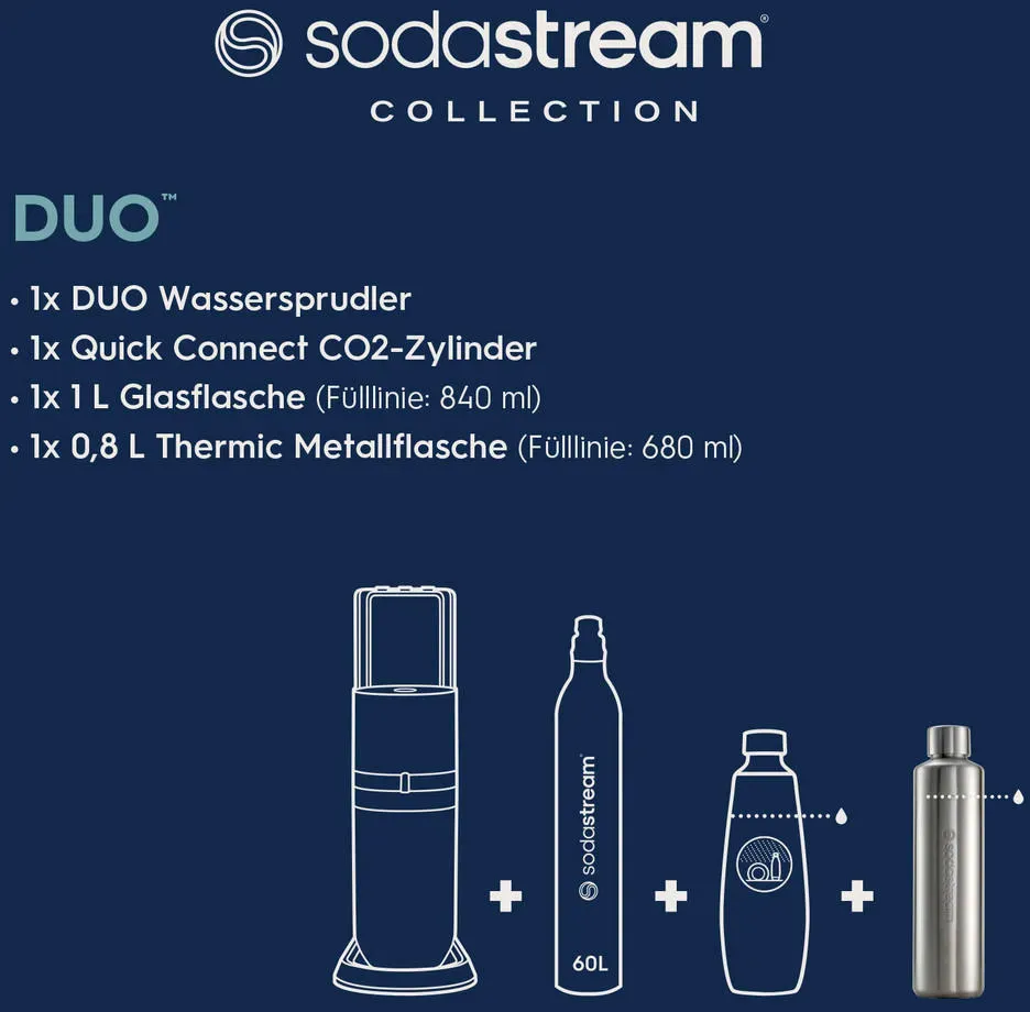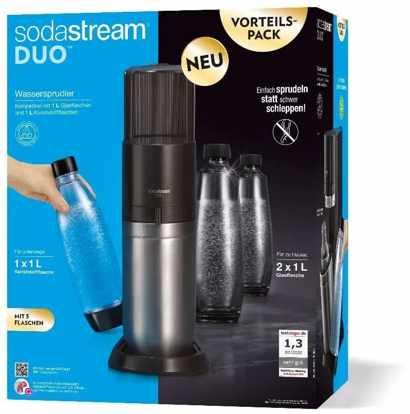 Kategorie: Wassersprudler - Sodastream - GTIN:7290113761308 - 2 x 1 Liter Glasflasche + 1 x 1 Liter Kunststoffflasche + 1 x Quick - 129,99 Euro bei expert TechnoMarkt - gefunden von billiger.de Ein Allrounder-Paket in Titan, das den SodaStream Duo mit einer Glaskaraffe, einer PET-Flasche, einer Metallflasche und einem Zylinder bietet, für maximale Flexibilität. ![]() ![]() Sodastream Duo titan + Glaskaraffe + PET-Flasche + Metallflasche + Zylinder