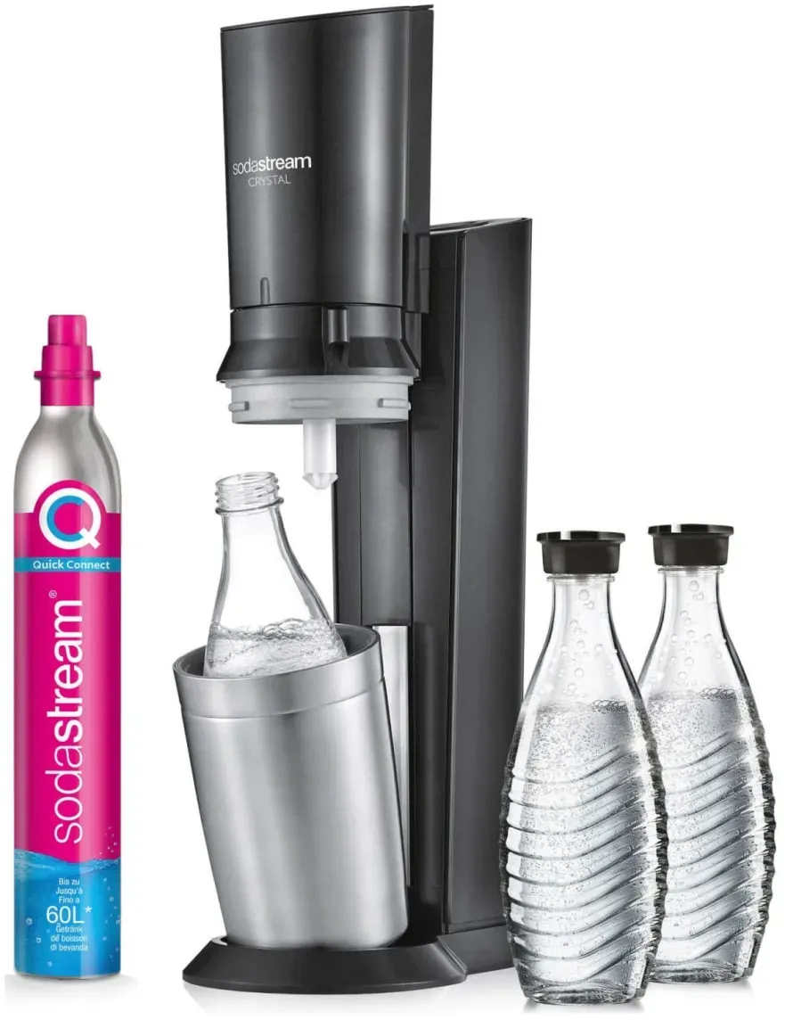 Kategorie: Wassersprudler - Sodastream - GTIN:7290116742380 - Der SodaStream Crystal black/metal ermöglicht dir eine ressourcenschonende und nachhaltige Konsumation von Getränken. Mühsames Flaschenschleppen gehört der Vergangenheit an und es können jährlich einige Flaschen gespart werden. Das moderne Design passt ideal in deine Küche und dank der moderaten Flaschenhöhe von 44 cm können diese problemlos im Kühlschrank verstaut werden. In den neuen Glaskaraffen kann bis zu 1 Liter Flüssigkeit gelagert werden und sie lassen sich ganz einfach im Geschirrspüler reinigen. Wer etwas Abwechslung im Alltag möchte, kann mit diverser Sirup das Wasser etwas aufpeppen. Produktinformation: - Elegantes Design, edles Glas - Spülmaschinenfeste Glaskaraffe - Patentiertes Quick Connect System ermöglicht einen einfacheren und intuitiveren Einsatz des Zylinders - Hochwertiger Edelstahlflaschenbehälter mit sanfter öffnungsmechanik - Kabellos, kein Strom erforderlich - Soda-Club oder SodaStream Kunststoff-Flaschen sind nicht kompatibel - Der Crystal von SodaStream ist nur für die Verwendung mit Glaskaraffen mit Schraub- oder Champagnerverschluss geeignet - Das Füllvolumen der Glaskaraffe beträgt bis zur Fülllinie 615 ml - Nur mit dem SodaStream 60 Liter pinker Quick Connect Kohlensäure-Zylinder kompatibel Lieferumfang: - 1x Trinkwassersprudler Crystal black/metal - 1x spülmaschinenfeste Glaskaraffe, 615 ml - 1x 60 Liter pinker Quick Connect Kohlensäure-Zylinder. - 84,81 Euro bei Galaxus.de - ... Dieses Angebot beinhaltet den Wassersprudler mit einem Quick-Connect CO2-Zylinder und zwei Glaskaraffen, was ein gutes Starterpaket darstellt. ![]() ![]() SodaStream Crystal 3.0 Wassersprudler mit 1x Quick-Connect CO2-Zylinder und 2X Glaskaraffen, Silber, Schwarz, Titan, 45 cm