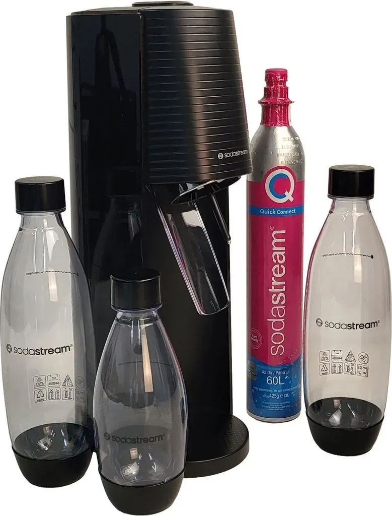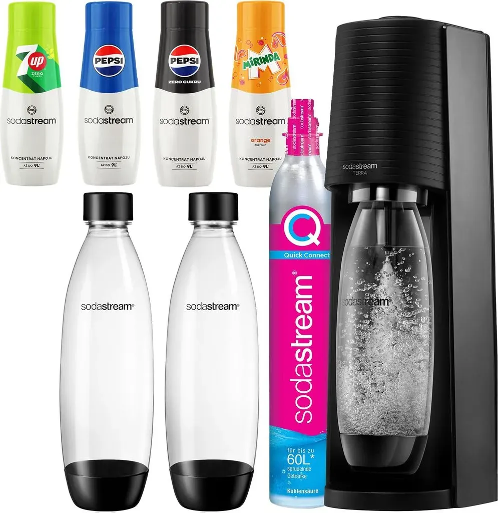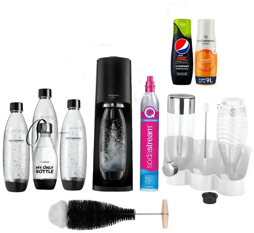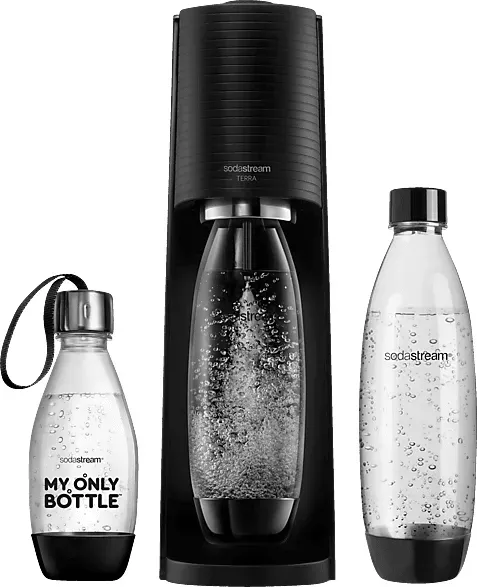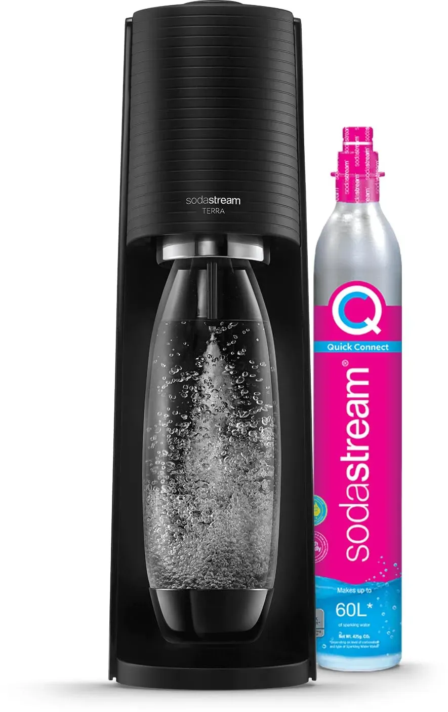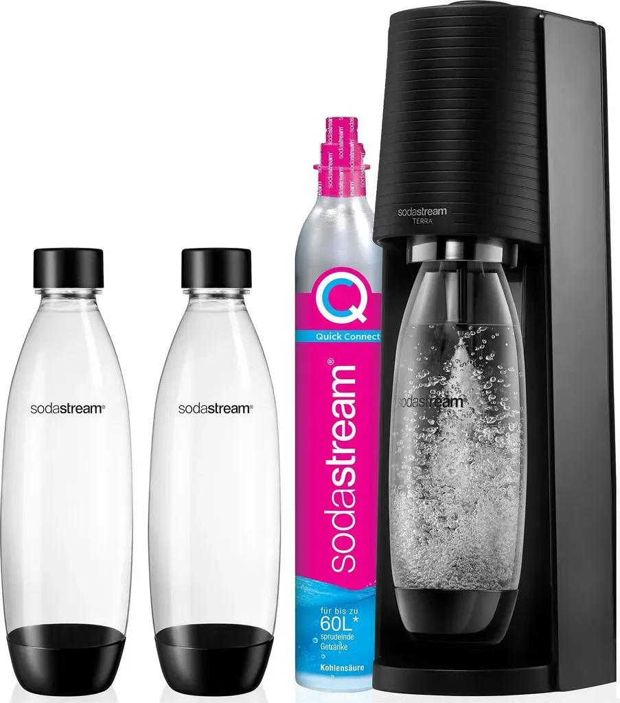 Kategorie: Wassersprudler - Sodastream - GTIN:7290113764231 - 1 Sodastream Wassersprudler Terra Black 2 verschmolzene Flaschen, spülmaschinenfest, 1 l 1 x CO2-Zylinder Quick Connect für Gas bis 60 l Einstellbare Gasstufe Kohlensäurehaltige Getränke können zubereitet werden - 72,99 Euro bei Amazon Marketplace Kitchen - gefunden von billiger.de Ein Vorteilspack in Schwarz, das eine gute Grundausstattung für den Start bietet. ![]() ![]() SODASTREAM Terra Vorteilspack Wassersprudler Schwarz