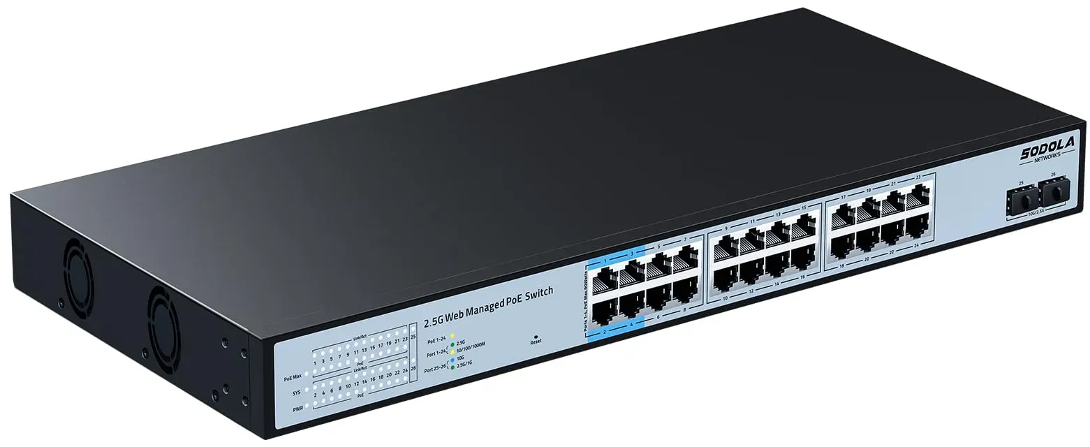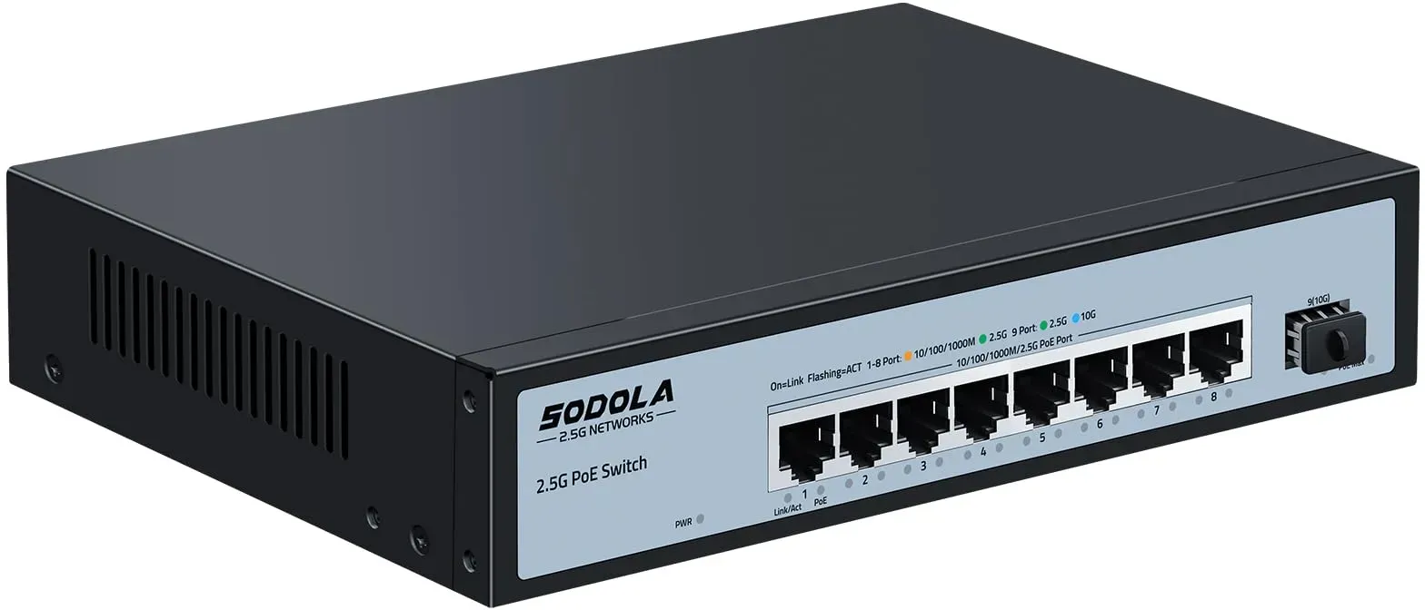 Kategorie: Netzwerk-Switches - sodola - 2,5G & 10G Hochgeschwindigkeitskonnektivität Erstellen Sie ein ultraschnelles 2,5Gb Managed Switch-Netzwerk mit 8 2,5G Ethernet-Ports (2,5GBase-T) und einem 10G SFP+ Uplink für anspruchsvolle Anwendungen wie 4K-Streaming, NAS-Datentransfers oder lagersensitives Gaming. Unterstützt Link Aggregation (LACP) für optimierte Lastverteilung. Einfache Web-Verwaltung für Heimanwender & Profis Konfigurieren Sie LACP, VLANs, QoS, IGMP Snooping und weitere Basisfunktionen mühelos über die webbasierte 2,5Gbits Switch-Oberfläche ohne CLI-Kenntnisse. Sichern Sie Ihr Netzwerk mit portbasiertem Zugriffsschutz und priorisieren Sie Geräte wie Gaming-PCs oder Workstations. Hochwertige Aluminium-Kühlung für stabile 2,5GbE-Leistung Das aufgerüstete Aluminiumgehäuse reduziert die Wärmeentwicklung um 40 % im Vergleich zu Stahl, sorgt für konstante 2,5GbE Switch-Geschwindigkeiten und minimale Paketverluste. Lüfterloses Design für absolut geräuschlosen Betrieb in Wohnräumen oder Home-Offices. Magnetfüße & Flexible MontageBefestigen Sie diesen 2,5G verwaltbaren Switch an Metalloberflächen (z. B. Racks, Schreibtische) mit 4 starken Magnetfüßen im Lieferumfang enthalten. Alternativ können Sie den Switch auch einfach platzsparend auf flachen Oberflächen (z. B. Schreibtisch, Regal) abstellen. Breite Kompatibilität & Zukunftssicherheit Der Multi-Gig Managed Switch ist kompatibel mit PCs, Servern, NAS (z. B. 2,5G NAS), 2,5G WLAN 6 Access Points und mehr. Für ... Ein 8-Port 2.5G PoE Switch mit 10G SFP+ Uplink, der sich hervorragend für die Stromversorgung von PoE-Geräten wie IP-Kameras oder Access Points eignet. ![]() ![]() SODOLA 8 Port 2.5G PoE Switch 120W|1X 10G SFP+&8 x2.5GBase-T PoE Ports, IEEE802.3af/at, Plug & Play 2.5GbE PoE Netzwerk Switch