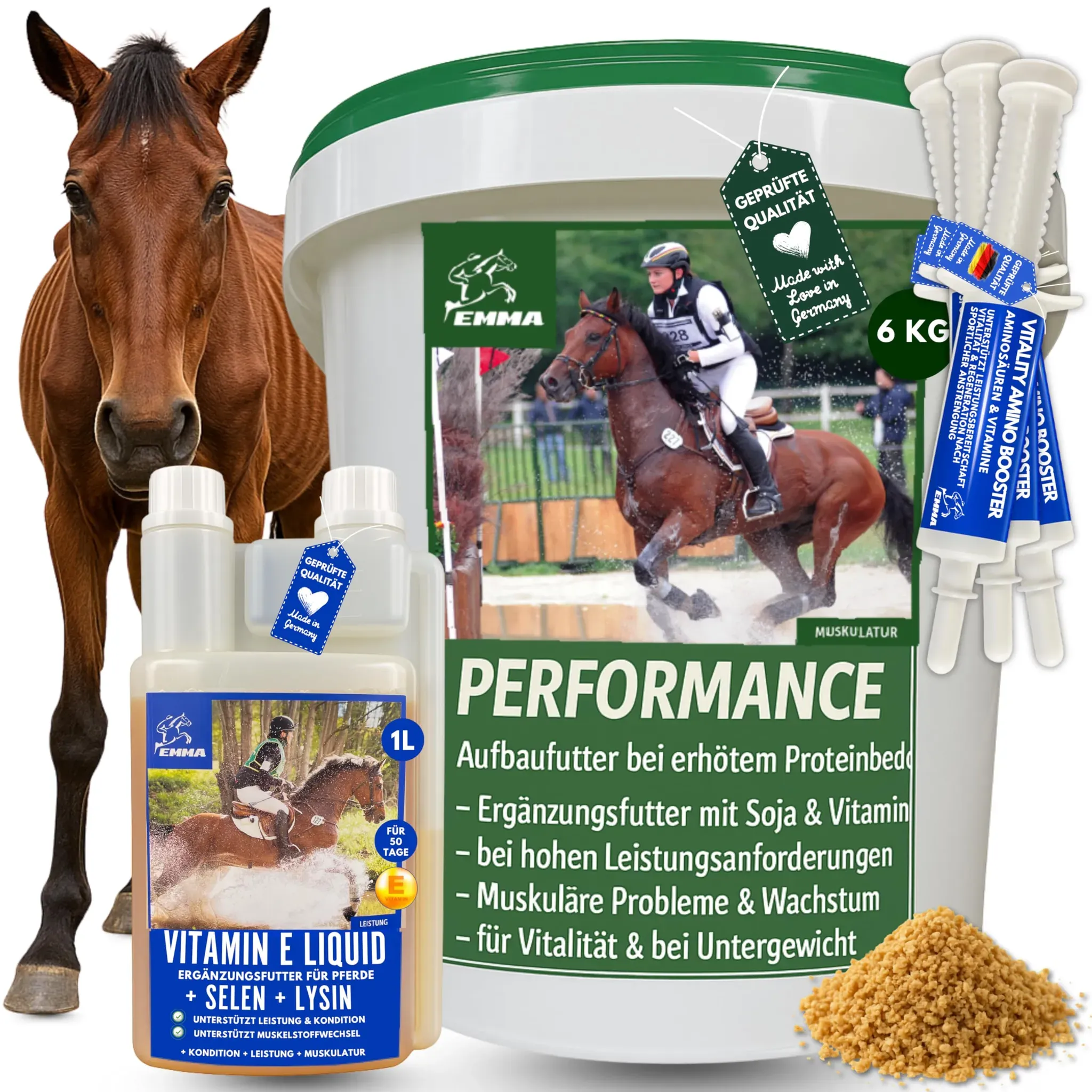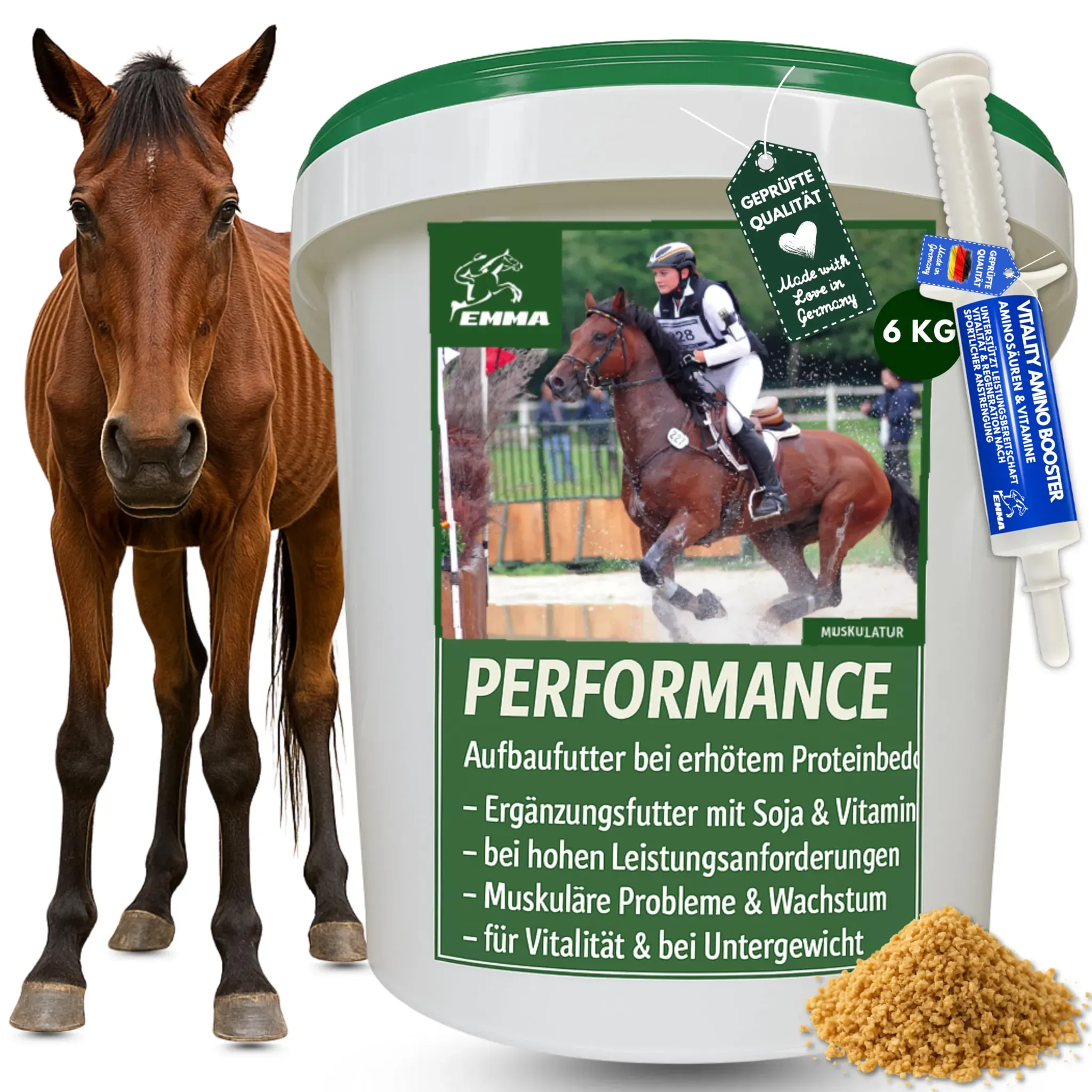 Kategorie: Pferdefutter - Emma - GTIN:4260509334280 - Gesunde Muskulatur - Unser Performance plus aminosäuren Booster ist extra plus für Muskeln, Skelett & Vitalität - Muskel Pulver mit Soja Protein einfach in das Futter = Muskelaufbau Pferd I Vitamin E und Selen Pferd I Vitamin B komplex B1 B2 B6 B 12 Sojaextraktionsschrot Pferd I Ergänzungsfutter mit Sojaschrot Pferd zur Auffütterung oder in Aufbauphasen für kräftige Muskulatur & höheres Leistungsvermögen I Zusatzfutter für ältere Pferde I für untergewichtige Pferde gezielter Muskelaufbau Pferd I Ergänzungsfutter für Muskulatur, Skelett & Vitalität 6 Kg I Pferde um den Muskelaufbau zu unterstützen mit Aminosäuren komplex mit Sojaprotein, Methionin & Lysin für Pferde I optimale Leistungsfähigkeit durch spezielle Kombination von Vitaminen, Spurenelemente & Mineralstoffe I Einfach dem Kraftfutter, Mash, Müsli, Futter, Pellets & Leckerlie beimischen I unterstützt das Immunsystem & Stoffwechsel Pferdefutter zum Zunehmen I EMMA Performance Zusatzfutter mit Soja Protein, Vitamine & Spurenelemente & essentielle Aminosäuren Komplex Pulver für ihr Pferd I B-Vitamine Pferd, Vitamin A Pferd, Vitamin C Pferd, Vitamin B6, Vitamin B1 Pferd, Vitamin E Pferd, Vitamin B12 Pferd, Vitamin K Pferd, Calcium Pferd, Vitamin K Pferd, Folsäure Pferd, Eisen Pferd , Aminosäuren Pulver anstatt Amino Liquid - Energie fürs Pferd - Leistungssport - Aufbau von Muskeln & Muskelerhalt Pferdefutter unterstützt Aufbau Muskulatur mit Vollfett-Sojabohne I ... ![]() ![]() Sojaschrot Pferd - Aufbaufutter Pferd mit Vitamin E Aminosäuren B-Vitamine 6Kg Zusatzfutter Muskelaufbau Soja Protein Pulver für Gewichtszunahme I Weight Gainer Zunehmen bei Untergewicht