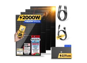 Kategorie: Solaranlagen - solakon - GTIN:4262399773125 - Premium Bauteile - Das 2000W Balkonkraftwerk besteht nur aus hochwertigen Bauteilen. 4x bifaziale 500W Tongwei TWMNH54HD Solarmodule, 8x 3,0m DC-Verlängerungskabel, 1x 10m Kabel zur Steckdose, 1x Solakon ONE Balkonkraftwerk Speicher mit 2,11kWh und 800W Integrierten Hybrid-Wechselrichter.2000W maximale Auslastung - Die Power Lösung mit 4x 500W Modulen erzeugt maximale Leistung, um lange und konstant mit 800W einzuspeisen! Profitieren Sie außerdem von 30% mehr Energie durch bifaziale*2 Solarmodule und 2 zusätzliche Stunden Strom dank modernsten N-Type*4 Zellen.Transparenz & Kontrolle per Solakon App - Mit der Solakon-App überwachen Sie Wechselrichter & Speicher Daten per WLAN-Funktion in Echtzeit. Sie sind direkt informiert über tägliche & jährliche Solarerträge & CO2-Einsparungen! Dank einfacher Einrichtung und intuitiver Bedienung direkt startklar! Höchste Server-Standards durch deutsche Eigenentwicklung!Inklusive 2,11 kWh speicher - Das Balkonkraftwerk mit Speicher macht die Energiegewinnung noch effektiver. Speichern Sie den erzeugten Strom in der Solakon ONE Solarbank zwischen und nutzen Sie diesen zu einem späteren Zeitpunkt.Mehr Stromertrag dank N-Typ*4 & bifazialer Module*2 - Unsere Premium-Module liefern auch bei diffusem Licht zuverlässig Energie und sichern Ihnen langfristig höhere Ersparnisse.Material- Solarmodul bestehend aus gehärtetem Glas, monokristallinen Silizium-Solarzellen, Kunststofolie, ... ![]() ![]() Solakon® 2000W Balkonkraftwerk mit Speicher - Balkonkraftwerk 2000W komplett Steckdose - 800W Integrierten Hybrid-Wechselrichter - Solakon ONE mit 2,11 kWh - 4X 500W bifaziale Solarmodule