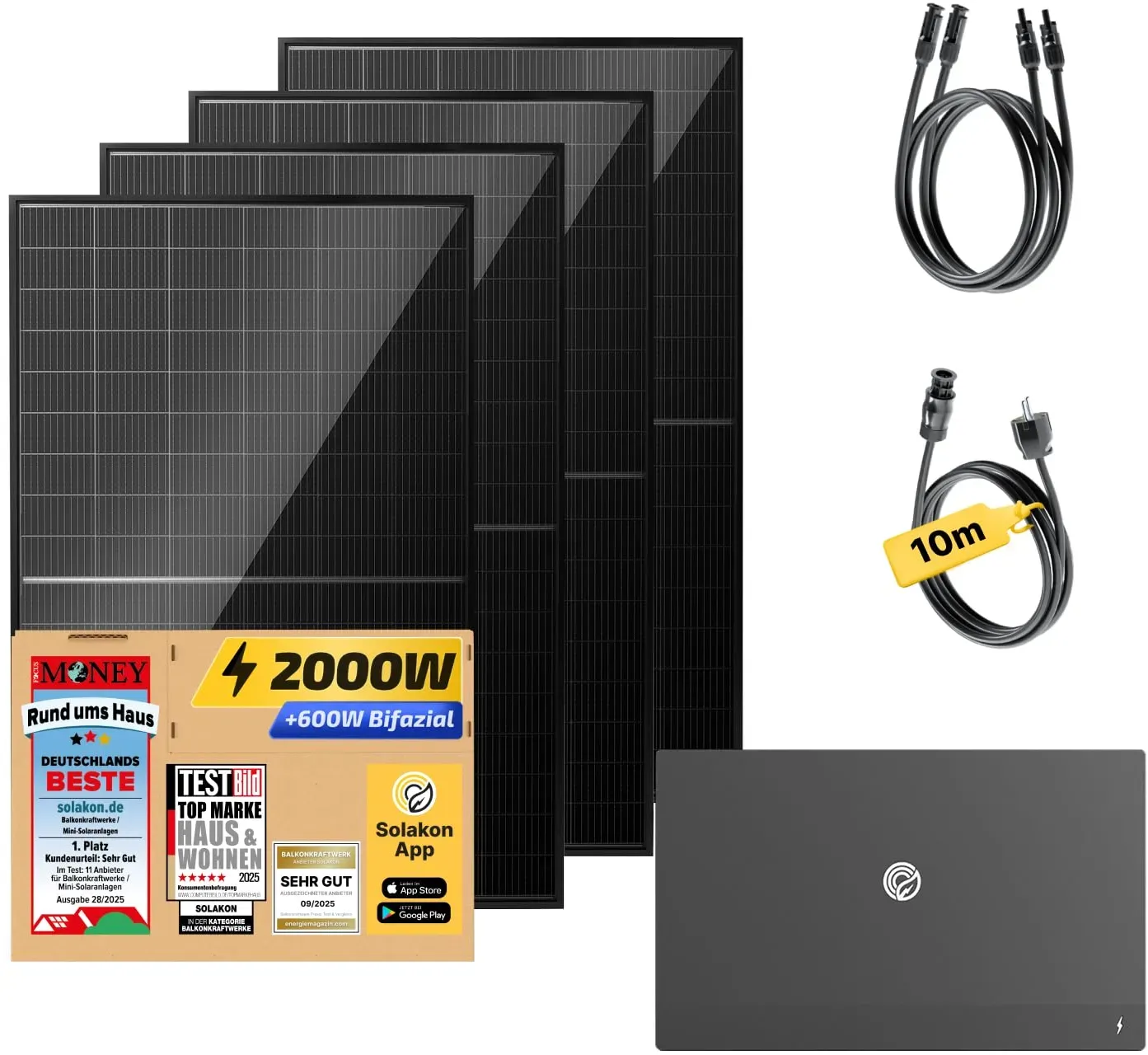 Kategorie: Solaranlagen - solakon - Premium Bauteile - Das 1000W Balkonkraftwerk besteht nur aus hochwertigen Bauteilen. 2x bifaziale 500W Tongwei TWMNH54HD Solarmodule, 4x 3,0m DC-Verlängerungskabel, 1x 10m Kabel zur Steckdose, 1x Solakon ONE Balkonkraftwerk Speicher mit 2,11kWh und 800W Integrierten Hybrid-Wechselrichter. Kinderleichte Installation - Das Balkonkraftwerk kann ohne Elektriker oder Fachmann in ca. 1-2h aufgebaut werden. Profitieren Sie von 8.000 Ladezyklen und einem hohen Wirkungsgrad von 70%. Transparenz & Kontrolle per Solakon App - Mit der Solakon-App überwachen Sie Wechselrichter & Speicher Daten per WLAN-Funktion in Echtzeit. Sie sind direkt informiert über tägliche & jährliche Solarerträge & CO2-Einsparungen! Dank einfacher Einrichtung und intuitiver Bedienung direkt startklar! Höchste Server-Standards durch deutsche Eigenentwicklung! Inklusive 2,11 kWh speicher - Das Balkonkraftwerk mit Speicher macht die Energiegewinnung noch effektiver. Speichern Sie den erzeugten Strom in der Solakon ONE Solarbank zwischen und nutzen Sie diesen zu einem späteren Zeitpunkt. Mehr Stromertrag dank N-Typ*4 & bifazialer Module*2 - Unsere Premium-Module liefern auch bei diffusem Licht zuverlässig Energie und sichern Ihnen langfristig höhere Ersparnisse. Lieferinformationen - Unser Balkonkraftwerk-Produkt wird in drei separaten Paketen versendet. Das 1. und 2. Paket enthalten die Solarmodule, während das 3. Paket sämtliches Zubehör wie den Wechselrichter, ... Ein umfangreiches 2000W Balkonkraftwerk mit 2,11 kWh ONE Speicher und 4x 500W PV-Modulen für höhere Energieerzeugung. ![]() ![]() Solakon 2000W Balkonkraftwerk mit Speicher - 2000 Watt komplett Steckdose & 800W Hybrid-Wechselrichter - Solaranlage Komplettset - 4x 500W PV-Module & 2,11 kWh ONE Speicher für Balkonkraftwerk