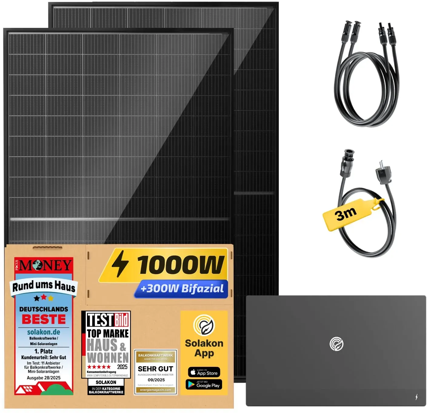Kategorie: Solaranlagen - solakon - Premium Bauteile - Das 900W Balkonkraftwerk besteht nur aus hochwertigen Bauteilen. 2x bifaziale 450W TWMNH-48HD Solarmodule, 4x 3,0m DC-Verlängerungskabel, 1x 10m Kabel zur Steckdose, 1x Solakon ONE Balkonkraftwerk Speicher mit 2,11kWh und 800W Integrierten Hybrid-Wechselrichter. Kinderleichte Installation - Das Balkonkraftwerk kann ohne Elektriker oder Fachmann in ca. 1-2h aufgebaut werden. Profitieren Sie von 8.000 Ladezyklen und einem hohen Wirkungsgrad von 70%. Transparenz & Kontrolle per Solakon App - Mit der Solakon-App überwachen Sie Wechselrichter & Speicher Daten per WLAN-Funktion in Echtzeit. Sie sind direkt informiert über tägliche & jährliche Solarerträge & CO2-Einsparungen! Dank einfacher Einrichtung und intuitiver Bedienung direkt startklar! Höchste Server-Standards durch deutsche Eigenentwicklung! Inklusive 2,11 kWh speicher - Das Balkonkraftwerk mit Speicher macht die Energiegewinnung noch effektiver. Speichern Sie den erzeugten Strom in der Solakon ONE Solarbank zwischen und nutzen Sie diesen zu einem späteren Zeitpunkt. Mehr Stromertrag dank N-Typ*4 & bifazialer Module*2 - Unsere Premium-Module liefern auch bei diffusem Licht zuverlässig Energie und sichern Ihnen langfristig höhere Ersparnisse. - 1079,99 Euro bei Amazon Marketplace Home Improvement - gefunden von billiger.de Dieses 1000W Balkonkraftwerk mit 2,11 kWh Speicher und 800W Hybrid-Wechselrichter bietet eine solide Leistung für den Hausgebrauch. ![]() ![]() Solakon 1000W Balkonkraftwerk mit Speicher - Balkonkraftwerk 1000W komplett Steckdose - 800W Integrierten Hybrid-Wechselrichter - Solakon ONE mit 2,11 kWh - 2x 500W bifaziale Solarmodule