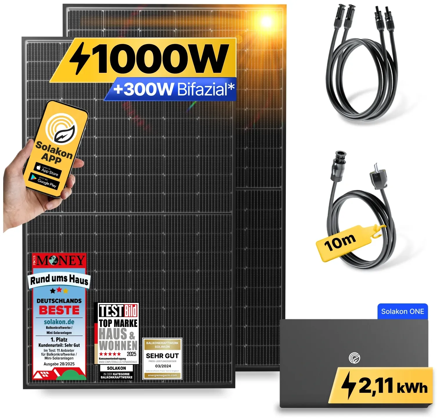 Zustand: Neu - Netzgebundene Systeme Netzgebundene Photovoltaikanlagen - Solakon - Lite10 - - 𝗣𝗿𝗲𝗺𝗶𝘂𝗺 𝗕𝗮𝘂𝘁𝗲𝗶𝗹𝗲 - Das 900W Balkonkraftwerk besteht nur aus hochwertigen Bauteilen. 2x bifaziale 450W TWMNH-48HD Solarmodule, 4x 3,0m DC-Verlngerungskabel, 1x 10m Kabel zur Steckdose, 1x Solakon ONE Balkonkraftwerk Speicher mit 2,11kWh und 800W Integrierten Hybrid-Wechselrichter. 𝗞𝗶𝗻𝗱𝗲𝗿𝗹𝗲𝗶𝗰𝗵𝘁𝗲 𝗜𝗻𝘀𝘁𝗮𝗹𝗹𝗮𝘁𝗶𝗼𝗻 - Das Balkonkraftwerk kann ohne Elektriker oder Fachmann in ca. 1-2h aufgebaut werden. Profitieren Sie von 8.000 Ladezyklen und einem hohen Wirkungsgrad von 70%. 𝗧𝗿𝗮𝗻𝘀𝗽𝗮𝗿𝗲𝗻𝘇 & 𝗞𝗼𝗻𝘁𝗿𝗼𝗹𝗹𝗲 𝗽𝗲𝗿 𝗦𝗼𝗹𝗮𝗸𝗼𝗻 𝗔𝗽𝗽 - Mit der Solakon-App berwachen Sie Wechselrichter & Speicher Daten per WLAN-Funktion in Echtzeit. Sie sind direkt informiert ber tgliche & jhrliche Solarertrge & CO-Einsparungen! Dank einfacher Einrichtung und intuitiver Bedienung direkt startklar! Hchste Server-Standards durch deutsche Eigenentwicklung! 𝗜𝗻𝗸𝗹𝘂𝘀𝗶𝘃𝗲 𝟮,𝟭𝟭 𝗸𝗪𝗵 𝘀𝗽𝗲𝗶𝗰𝗵𝗲𝗿 - Das Balkonkraftwerk mit Speicher macht die Energiegewinnung noch effektiver. Speichern Sie den erzeugten Strom in der Solakon ONE Solarbank zwischen und nutzen Sie diesen zu einem spteren Zeitpunkt. 𝗲𝗵𝗿 ... Ein 1000W Balkonkraftwerk mit 2x 500W bifazialen Modulen und 2,11 kWh Solakon ONE Speicher, das eine gute Leistung für den Preis bietet. ![]() ![]() Solakon® 1000W Balkonkraftwerk mit Speicher - 1000 Watt komplett Steckdose & 800W Integrierten Hybrid-Wechselrichter - 2x 500W bifaziale Solarmodule & 2,11 kWh Solakon ONE Speicher für Balkonkraftwerk