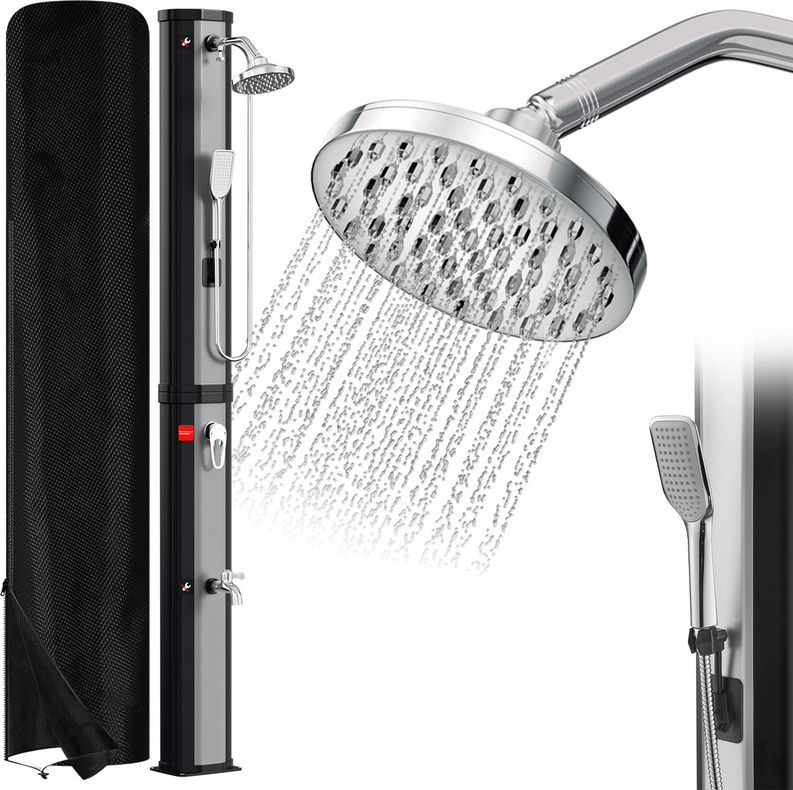 Kategorie: Poolzubehör - Goplus - ?Energieeffiziente Solarheizung: Diese innovative Dusche nutzt ausschließlich Solarenergie, um kaltes Wasser bis zu 60°C zu erwärmen, was komfortable Außenduschen ohne Strombedarf ermöglicht. Die maximale Wassertemperatur kann 60°C erreichen, bei einem Wasserdruck von bis zu 3,5 bar. ?Benutzerfreundliches Design: Die Außendusche ist mit einem 360° schwenkbaren Duschkopf und einem Wasserhahn ausgestattet, der einfache Anpassungen für Wasserfluss, Temperatur und Druck ermöglicht. Zusätzlich verfügt sie über eine praktische Fußdusche zum Waschen der Füße, ideal für Strandbesucher oder Poolnutzer. ?Stabile Konstruktion: Hergestellt aus hochwertigem PVC und verchromtem ABS-Material, ist unsere Dusche nicht nur stabil, sondern auch stilvoll, um Ihre Außeneinrichtung zu ergänzen. Sie enthält eine Schutzabdeckung, die die Langlebigkeit erhöht und Ihre Solardusche vor Witterungseinflüssen schützt. ?Einfache Montage: Die Installation der solarbeheizten Duschsäule ist mühelos, dank vorgebohrter Löcher an der Basis und 4 mitgelieferten Ankerschellen. Auch die obere und untere Sektion lassen sich schnell und einfach ohne Werkzeuge verbinden, was die Montage erleichtert. ?Breite Anwendung: Ob neben einem Pool, am Strand oder im Garten zum Waschen von Haustieren, diese Solar-Dusche fügt sich perfekt in jedes Außengelände ein. Ihre Praktikabilität und Anpassungsfähigkeit machen sie zu einer wertvollen Ergänzung, die Ihren Außenbereich bereichert. - 194,99 ... Diese Inoamity Solardusche bietet einen 360° drehbaren Duschkopf und eine Warm- & Kaltwasser-Regulierung für individuellen Duschkomfort. ![]() ![]() Inoamity 60L Solar Gartendusche, Solardusche mit 360° drehbarem Duschkopf und Warm- & Kaltwasser-Regulierung, bis zu 60°C, Gartendusche Aussendusche für Garten, Hinterhof und Strand