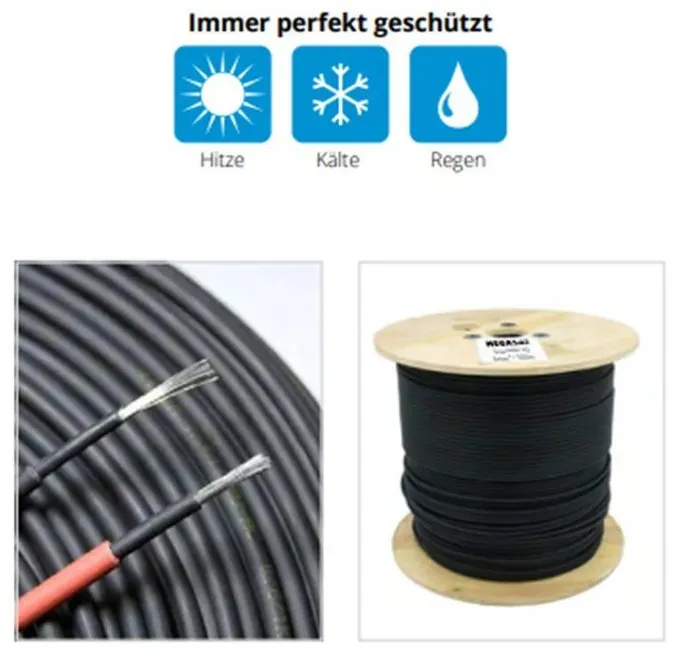 Kategorie: Photovoltaik-Zubehör - Solartronics - GTIN:4068508007989 - solartronics Meterware 6mm2 Solarkabel verschiedene Längen als Ring ohne Stecker zur Verwendung in Solaranlagen zwischen PV-Modulen, Ladereglern und Batterien [ Achtung nicht zwischen Spannungswandler und Batterie!] abgelängt verlegefertig sofort verwendbar. [ Hohe Qualität und Langlebigkeit ]: solartronics PV-Kabel bieten durch spezielle Kupfer-Verzinnung und widerstandsfähige Polyolefin-Copolymer Isolierung eine hohe Lebensdauer von 2 n gemäß EN 50618 und ist somit eine zuverlässige Investition. Sie ist kompatibel mit allen gängigen Steckern, erhältlich in Schwarz und Rot und eignet sich optimal für PV Anlagen sowie andere Solaranwendungen wie Camping, Vanlife, Boot und für Festinstallationen. [ Made in Germany ]: solartronics verarbeitet nur deutsches Qualitätskabel made in Germany nach höchsten Standards und konfektioniert Solarkabel der Querschnitte 4mm2, 6mm2 und 10mm2 in Längen 1m - 50m sowie Ringe zu 100m in unserer eigenen Fertigung in Deutschland [ Hochwertige 3-fach zertifizierte Solarleitung ]: Unser Solarkabel H1Z2Z2-K ist nach EN 50618 und IEC 62930 zertifiziert. Es ist ausgelegt für 1.500 VDC (max. 1.800 VDC) und bietet höhere UV- und Wasserbeständigkeit, erhöhten Isolationswiderstand sowie mechanische Stabilität, ist erdverlegbar ,temperaturbeständing -40 C - 120 C und wasserdicht nach IP67. [ Vielseitigkeit und Kompatibilität ]: Die Solarleitung ist kompatibel mit allen gängigen Steckern ... Dieses rote HB-DIGITAL Solarkabel ist ebenfalls TÜV Rheinland zertifiziert und mit 599 Euro eine gute Alternative zum schwarzen Kabel. ![]() ![]() HB-DIGITAL 500m Solarkabel H1Z2Z2-K - TüV Rheinland zertifiziertes - 6mm2 flexibel UV witterungsbeständig PV Kabel reines Kupfer 1500V DC für Solarpanel Wechselrichter Photovoltaik - Rot