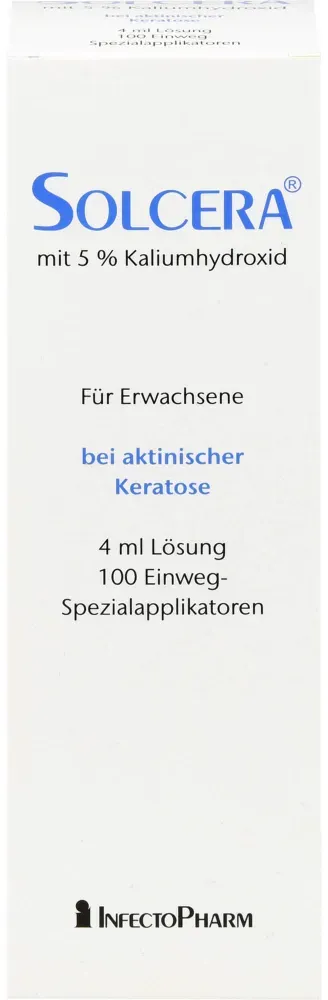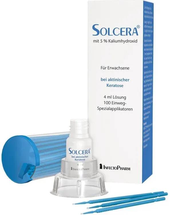 SOLCERA - EAN: 4260020520834 - Sonnenschäden einfach beheben Zur äußerlichen Behandlung Aktinischer Keratosen bei Erwachsenen mit einem intakten Immunsystem. Aktinische Keratosen, auch Lichtkeratosen oder solare Keratosen genannt, zeigen sich durch zunächst kaum tastbare und später raue, schuppige Hautstellen an Körperstellen, die im Laufe des Lebens häufig der Sonne (UV-Strahlung) ausgesetzt waren. Dieses Medizinprodukt sollte nur bei ärztlich bestätigter aktinischer Keratose angewendet werden.: Innovative Therapie von Aktinischen Keratosen überzeugend wirksam, sicher und gut verträglich* Hohe Patientenzufriedenheit und Compliance* * Reinhold U et al. Neuer therapeutischer Ansatz zur Behandlung der aktinischen Keratose mit Kaliumhydroxid 5 % Lösung (Solcera ). 22. Jahrestagung der DWFA NRW 2019 Köln, 28.11.-1.12.2019 (Poster). Wie ist Solcera anzuwenden? Tragen Sie die Solcera-Lösung zweimal täglich mit einem der beiliegenden Spezialapplikatoren auf alle betroffenen Bereiche auf. Wenn Sie dickere oder verhärtete Keratosen haben, wird Ihr Arzt Ihnen möglicherweise raten, Solcera dreimal täglich anzuwenden. Die Behandlungsfläche sollte sauber und trocken sein. Sorgen Sie bei jeder Anwendung für eine sehr gute Beleuchtung. Entfernen Sie den Standfuß zusammen mit der Flasche von der Box mit den Applikatoren, Stellen Sie den Standfuß mit der Flasche während der Anwendung immer auf eine feste und ebene Unterlage, um ein versehentliches Umkippen zu verhindern. Entnehmen Sie ... ![]() ![]() InfectoPharm Arzneimittel und Consilium Solcera Lösung zum Auftragen auf die Haut 4 ml